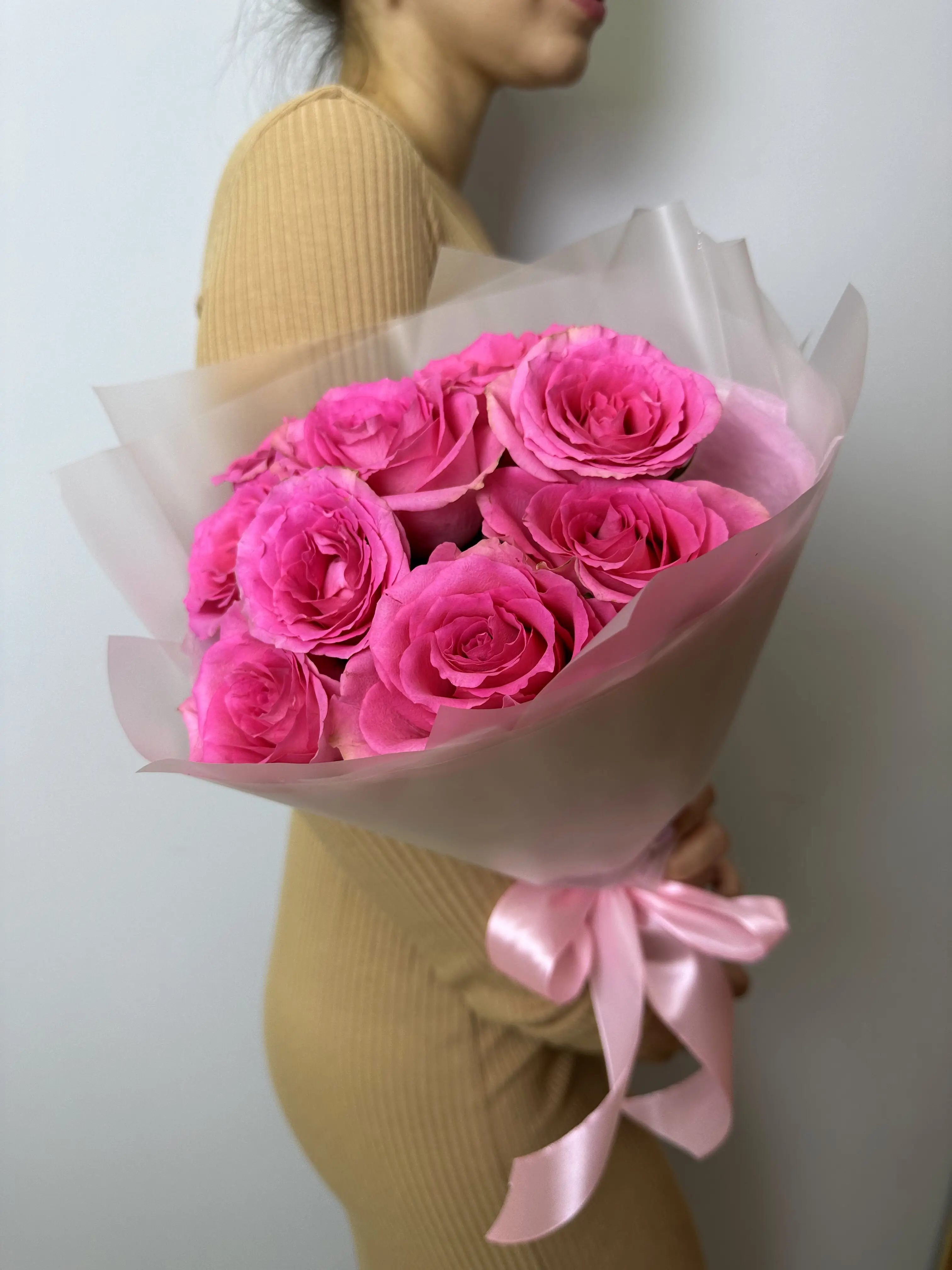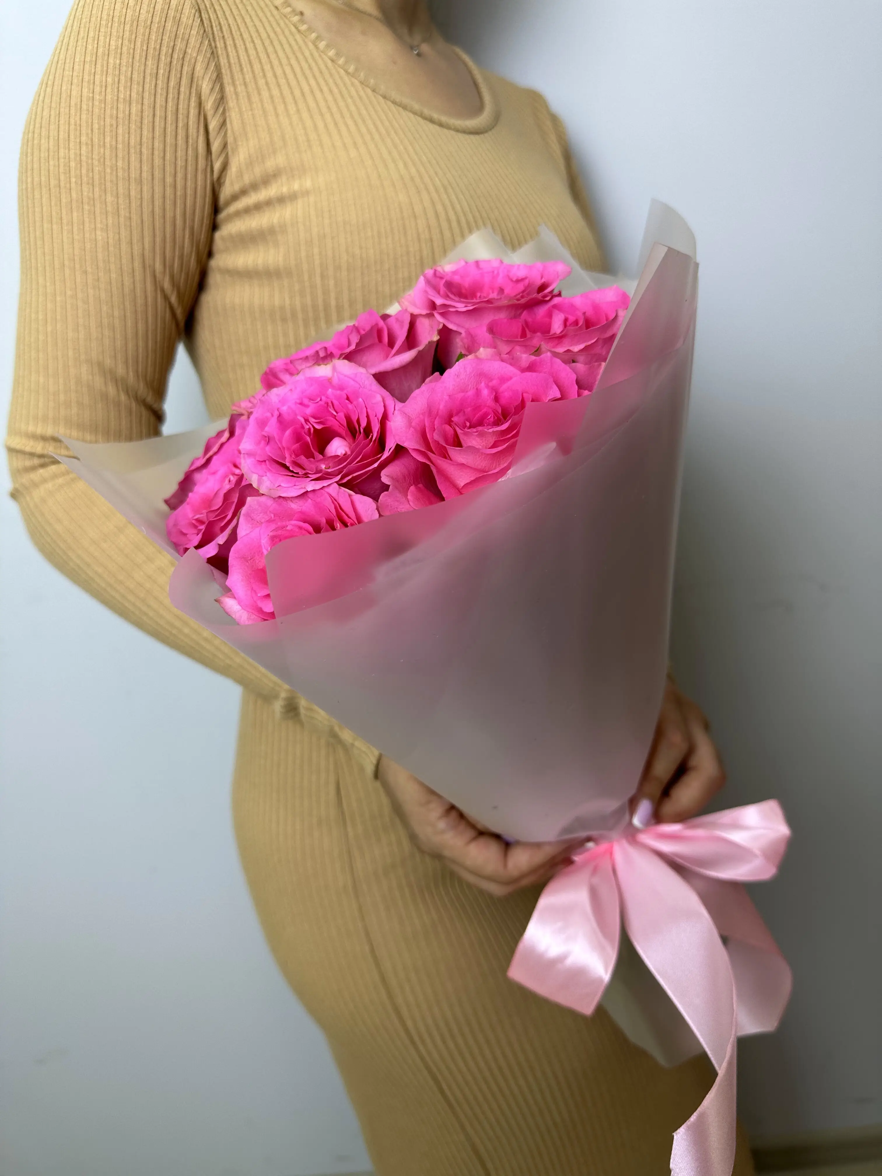 Представляем вашему вниманию изысканный букет из девяти розовых роз. Розовые розы – это символ нежности, женственности и романтических чувств. Этот букет станет прекрасным подарком на любой праздник или просто знаком внимания.