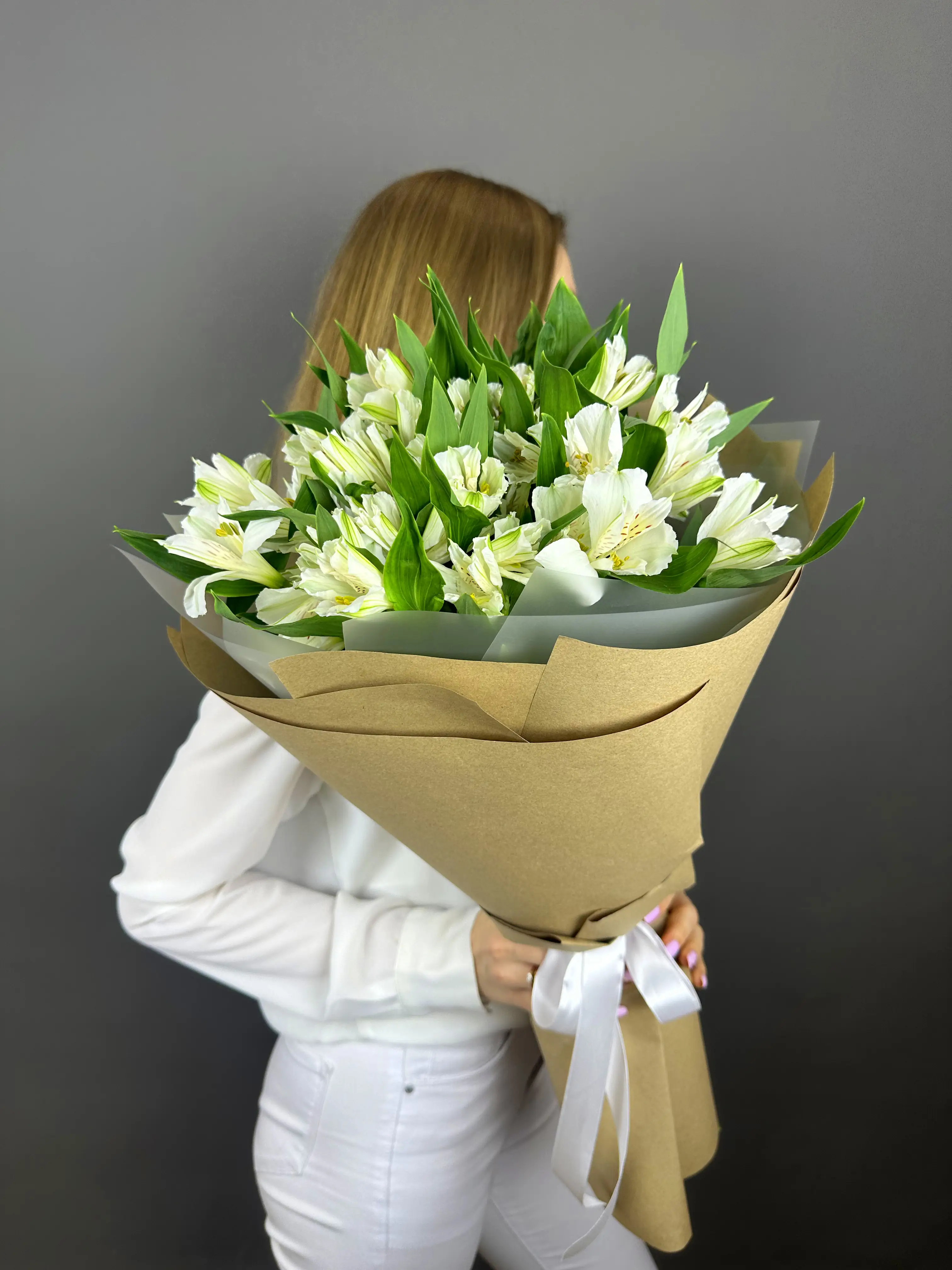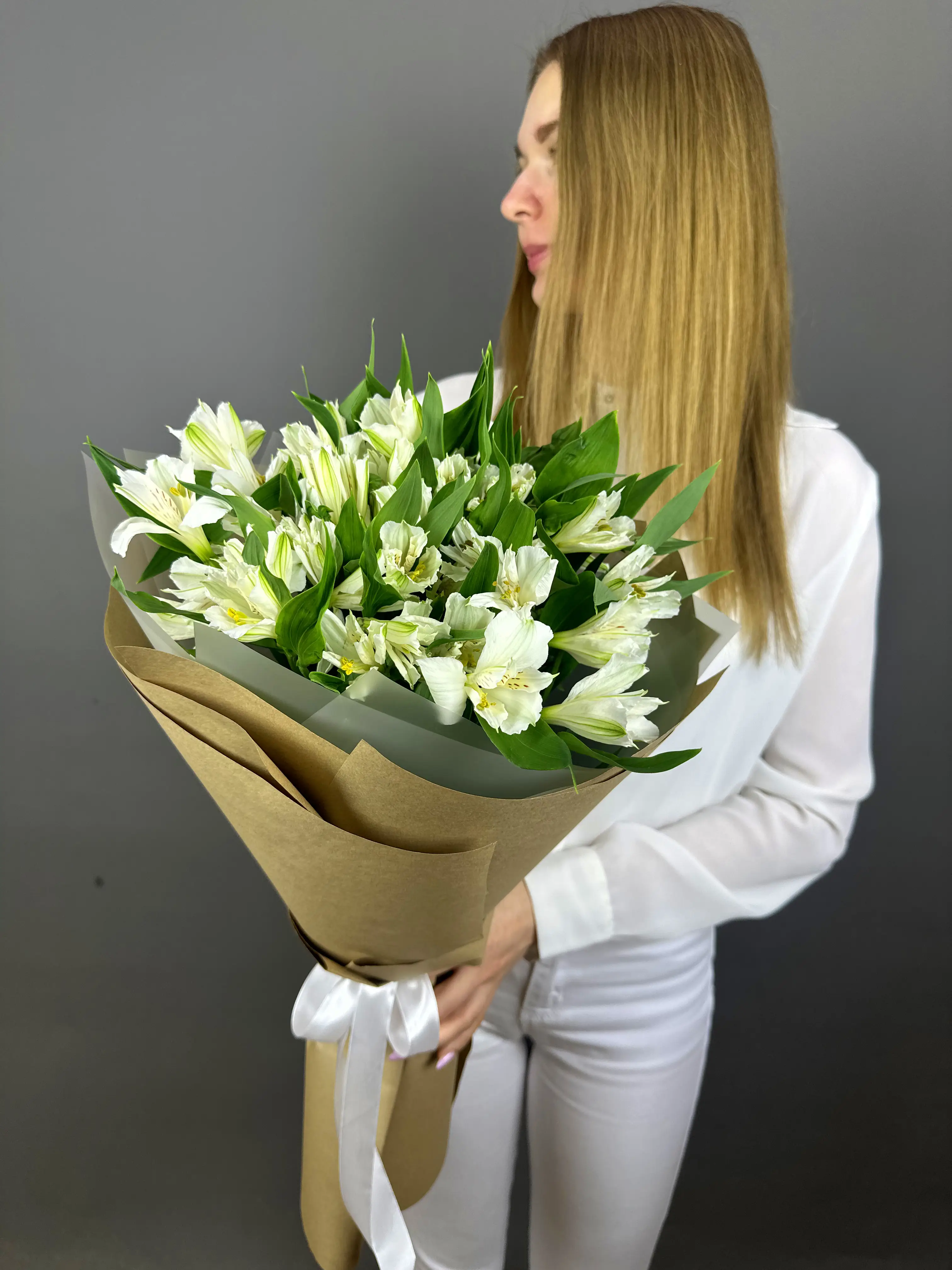 Предлагаем вашему вниманию изысканный букет из белоснежных альстромерий в стильной крафтовой упаковке. Это нежное творение флористов станет идеальным подарком для самых дорогих людей. Альстромерии – цветы, которые ассоциируются с искренностью и чистотой чувств, воплощая собой всю трогательность момента. Упакованные в крафт, они приобретают особый шарм и элегантность, добавляя букету актуальности и современности.