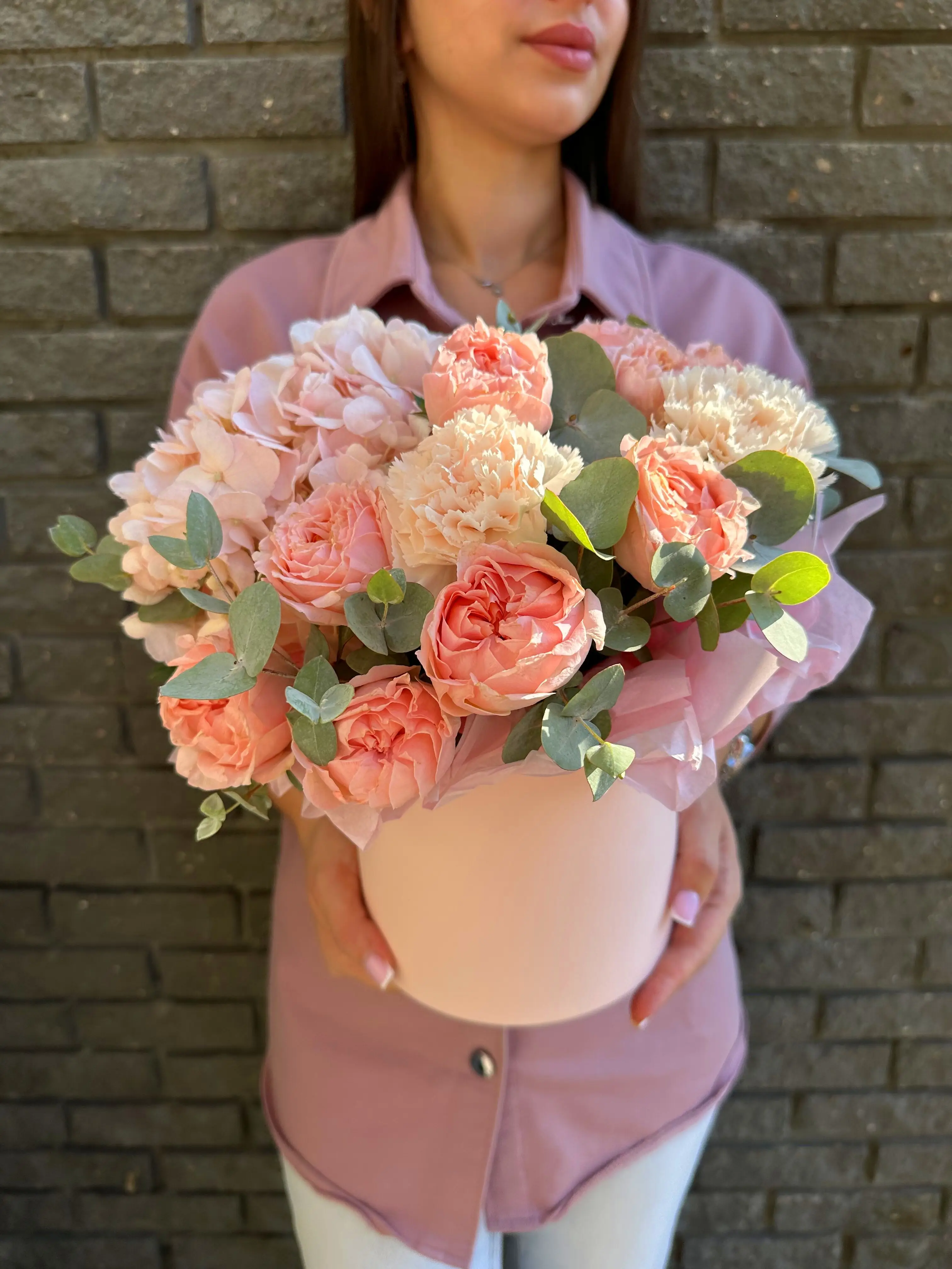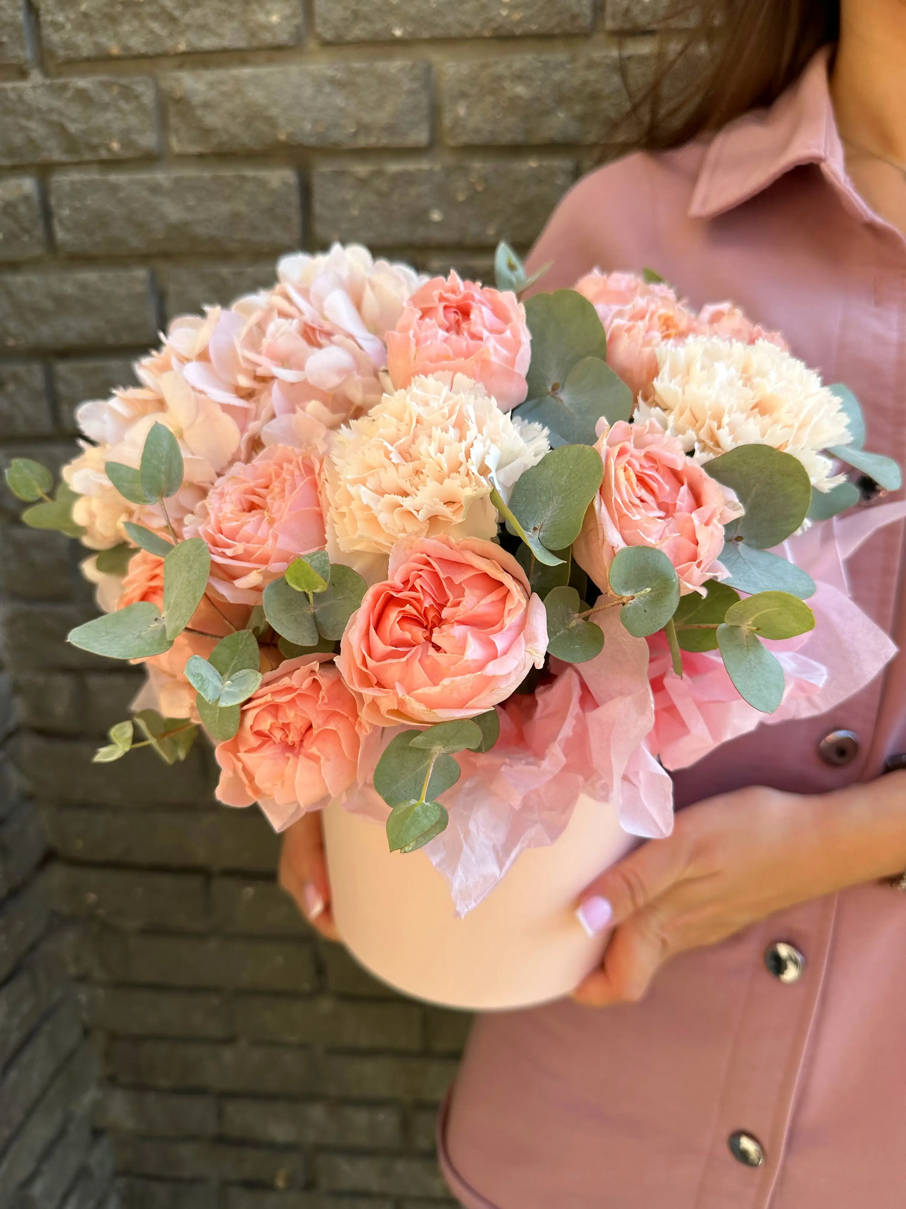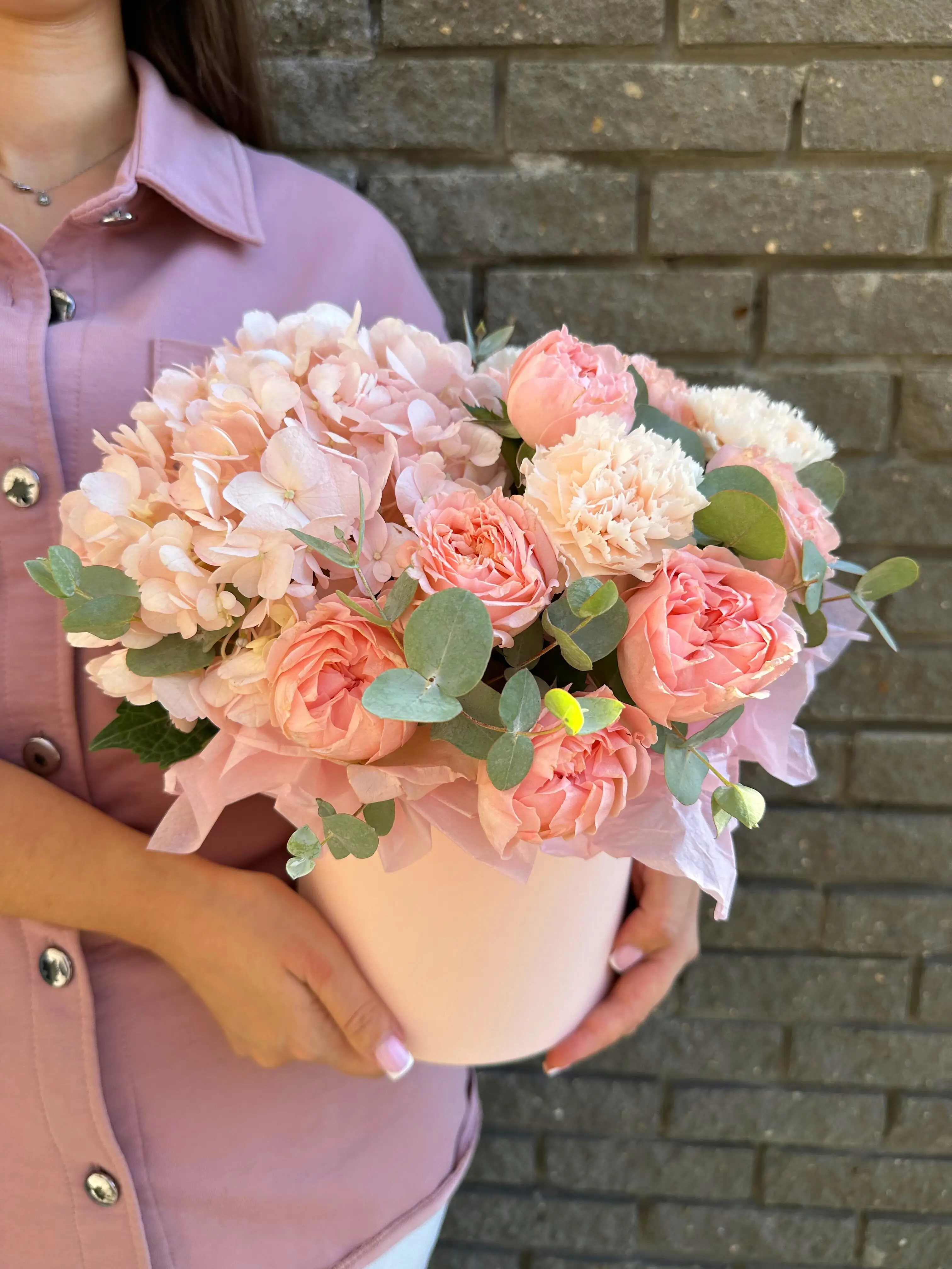 Коробка с гортензией и розой выделится среди стандартных букетов благодаря не только своему дизайну, но и удобству вручения — стильная упаковка подчеркивает индивидуальность и эксклюзивность композиции, делая её презентабельной и удобной для подарка.