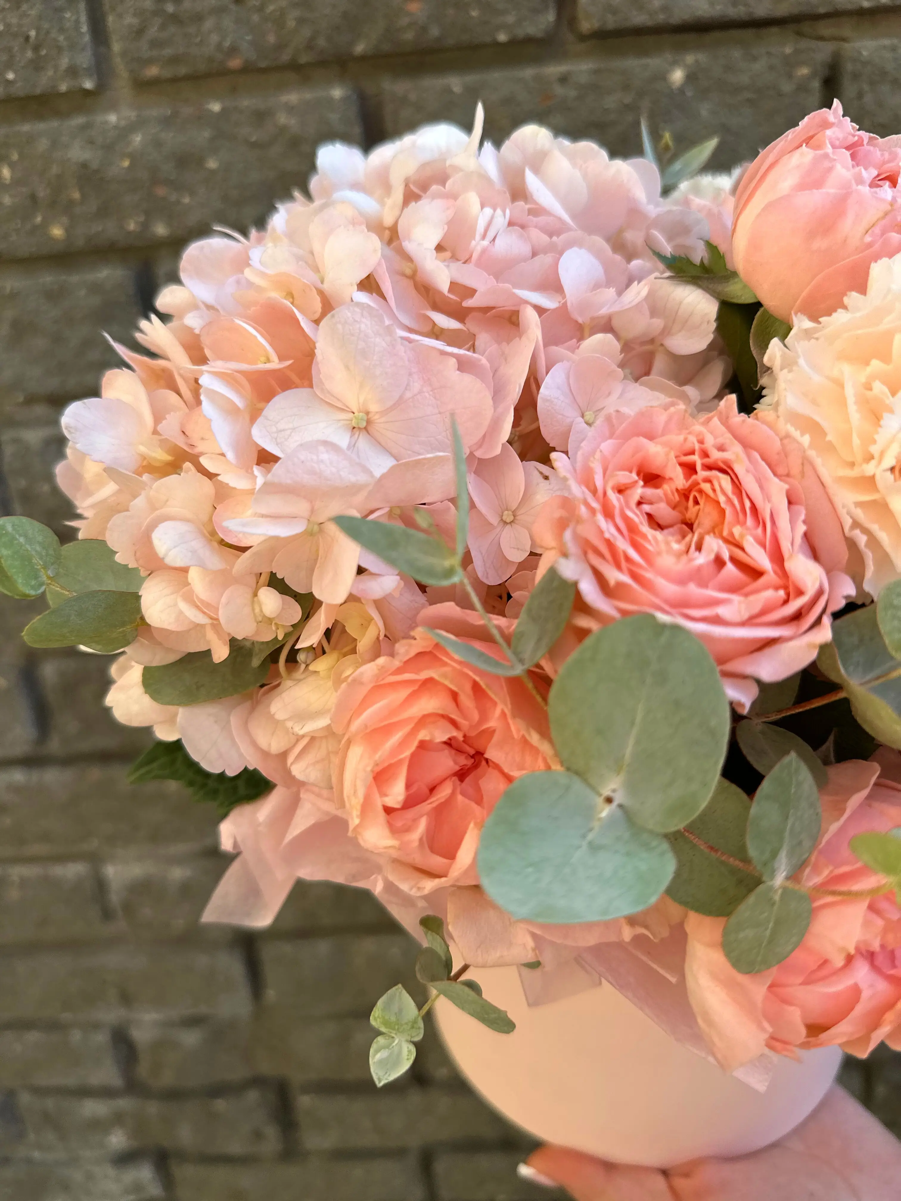 Гортензия с её крупными шапками нежных цветов символизирует искренность и преданность, а роза — вечный символ любви, страсти и уважения. Такое сочетание придает композиции особую глубину и выразительность, превращая её в идеальный подарок для женщин любого возраста.