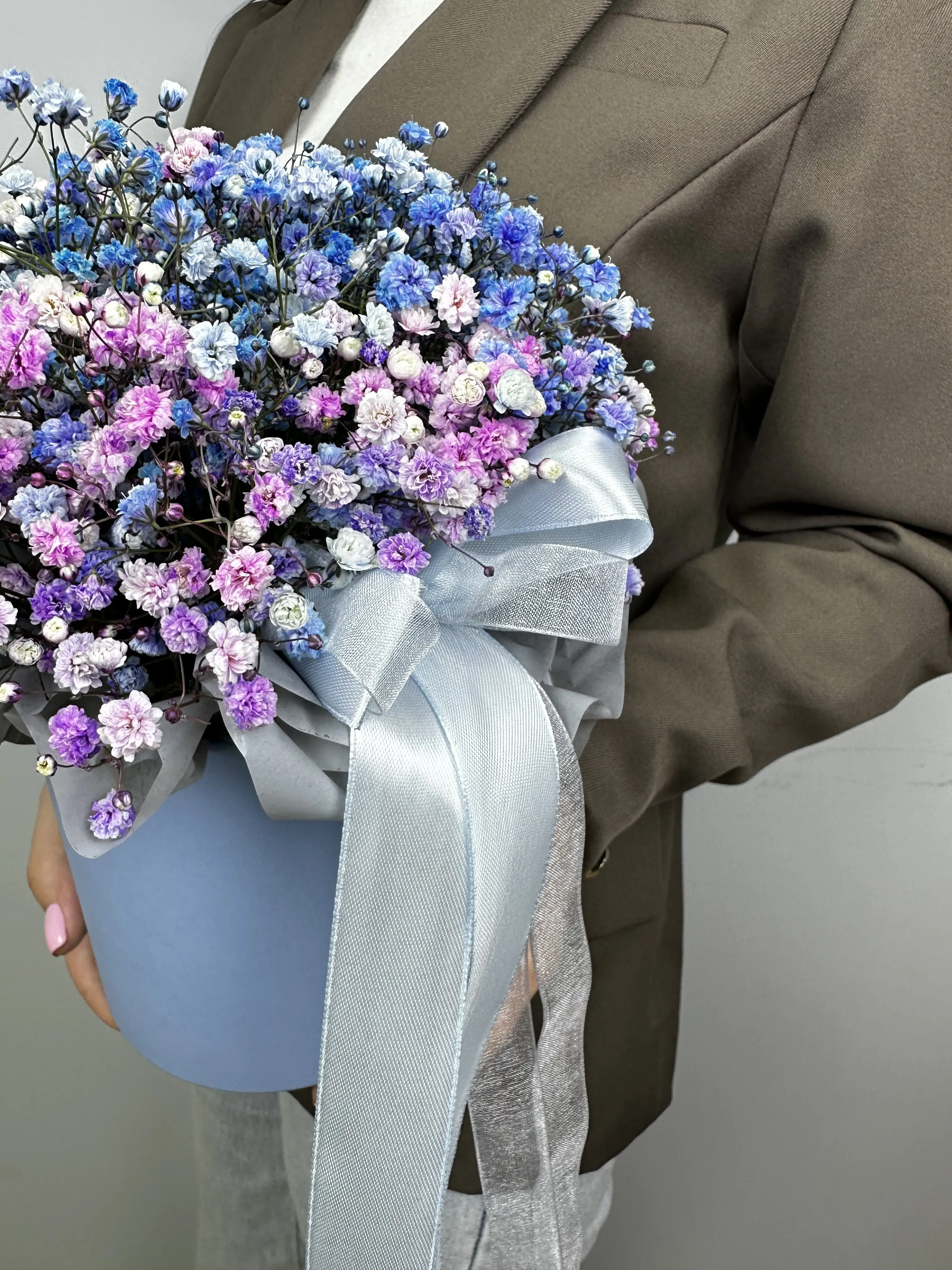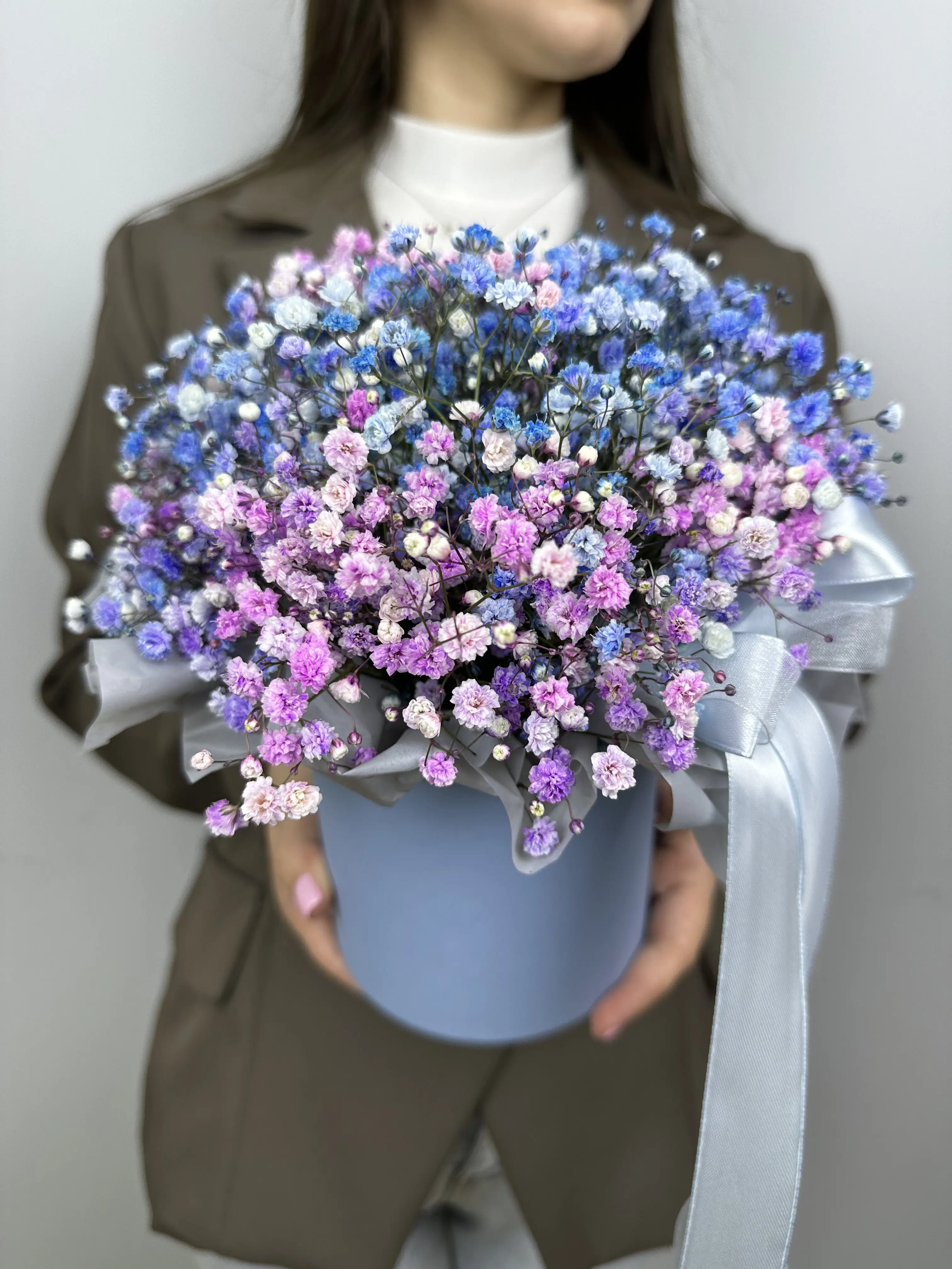 Свежая и яркая композиция в шляпной коробке из радужной гипсофилы — это не только стильный, но и символический подарок. Радужная гипсофила — символ искренней радости и благополучия, который принесёт светлые эмоции в любой дом.