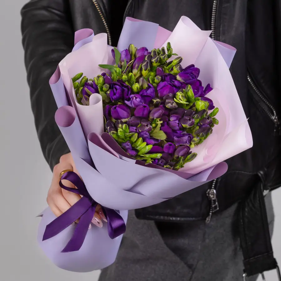 На фото - 15 Фиолетовых Фрезий в упаковке. В составе данной композиции: Фрезия - 15 шт,
