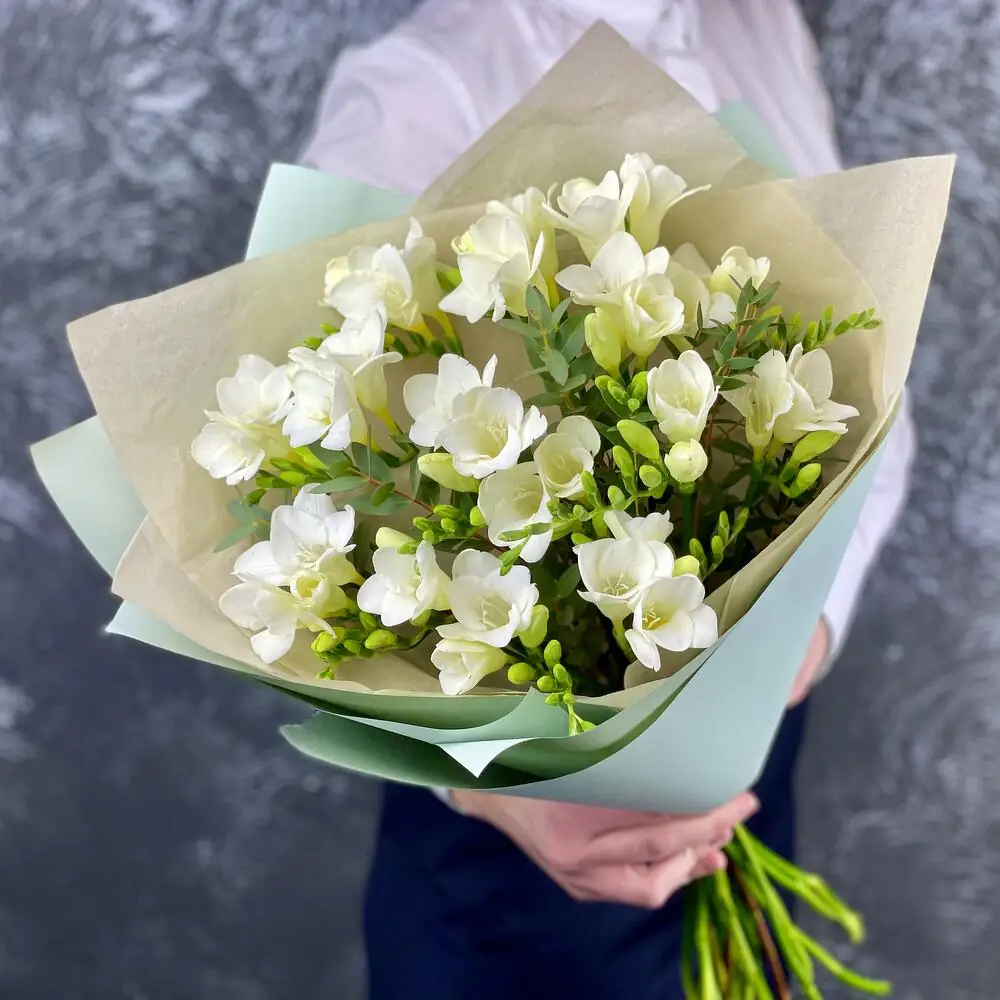 На фото - Фрезия и эвкалипт. В составе данной композиции: Фрезия - 15 шт,