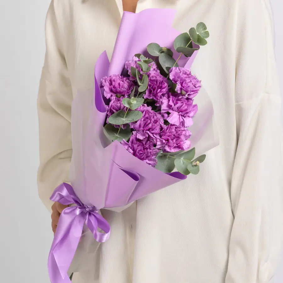У нас можно заказать 9 Сиреневых Гвоздик в упаковке за 1870 руб.