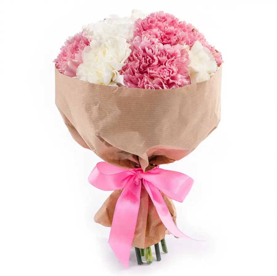 На фото - 15 Снежных и розовых Гвоздик. В составе данной композиции: Гвоздика белая и розовая - 15 шт.,
