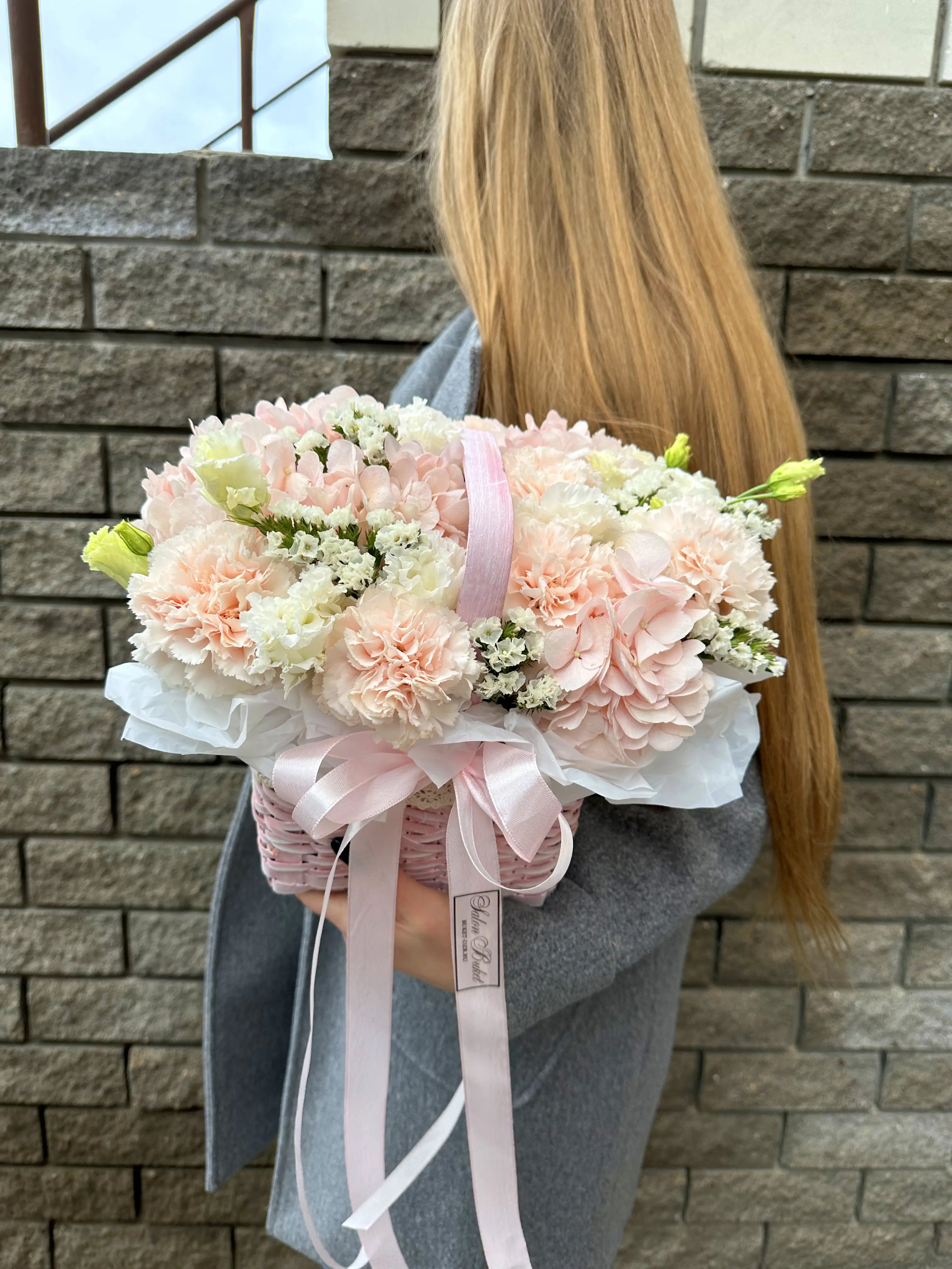 На фото - Корзина средняя с гвоздикой и гортензией . В составе данной композиции: Гортензия - 1 шт,
