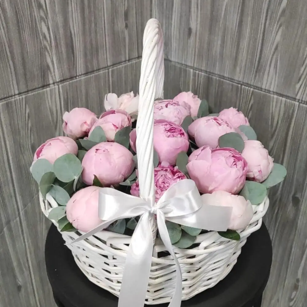 На фото - Нежные Розовые Пионы в Корзине . В составе данной композиции: Пион - 15 ,