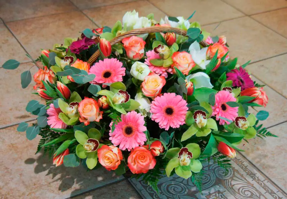 Монпасье - это радуга ароматных цветных леденцов. Наша корзина - именно такая, присмотритесь :) Буйство разноцветных гербер, роз, орхидей и лизиантуса в окружении сочной зелени.