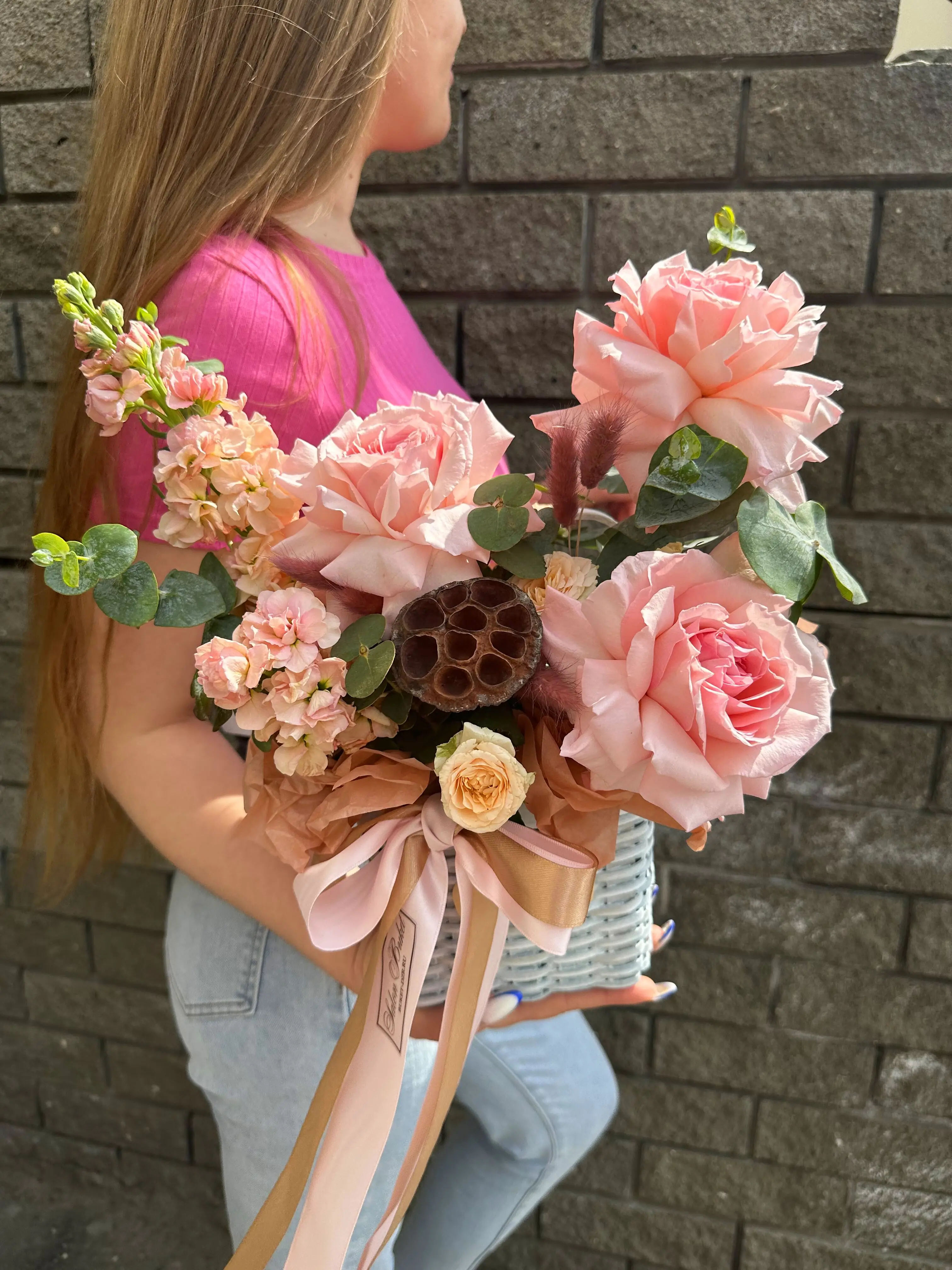 На фото - Корзина с пионовидными розами и маттиолой . В составе данной композиции: Пионовидная Роза розового цвета - 3 шт,