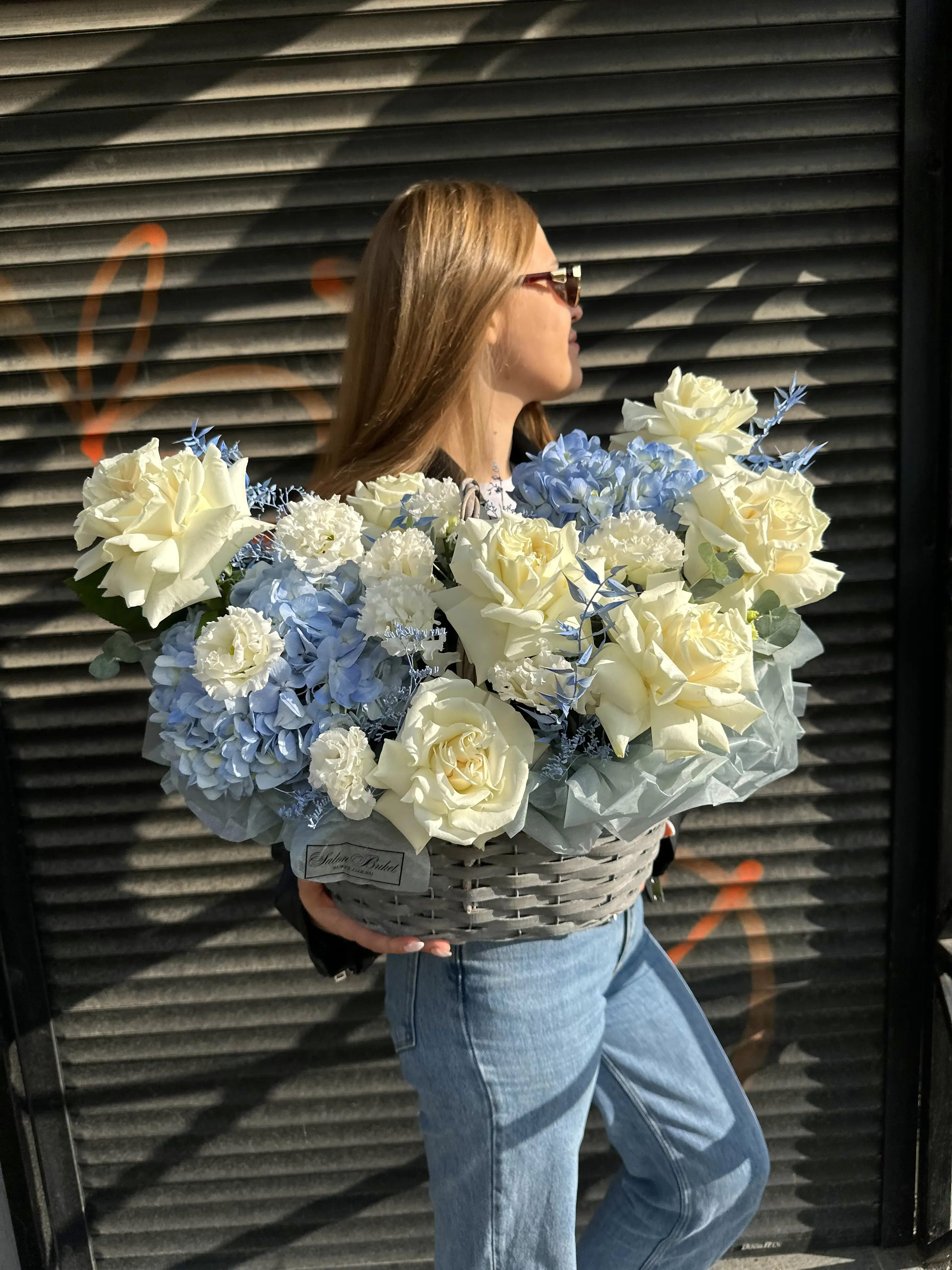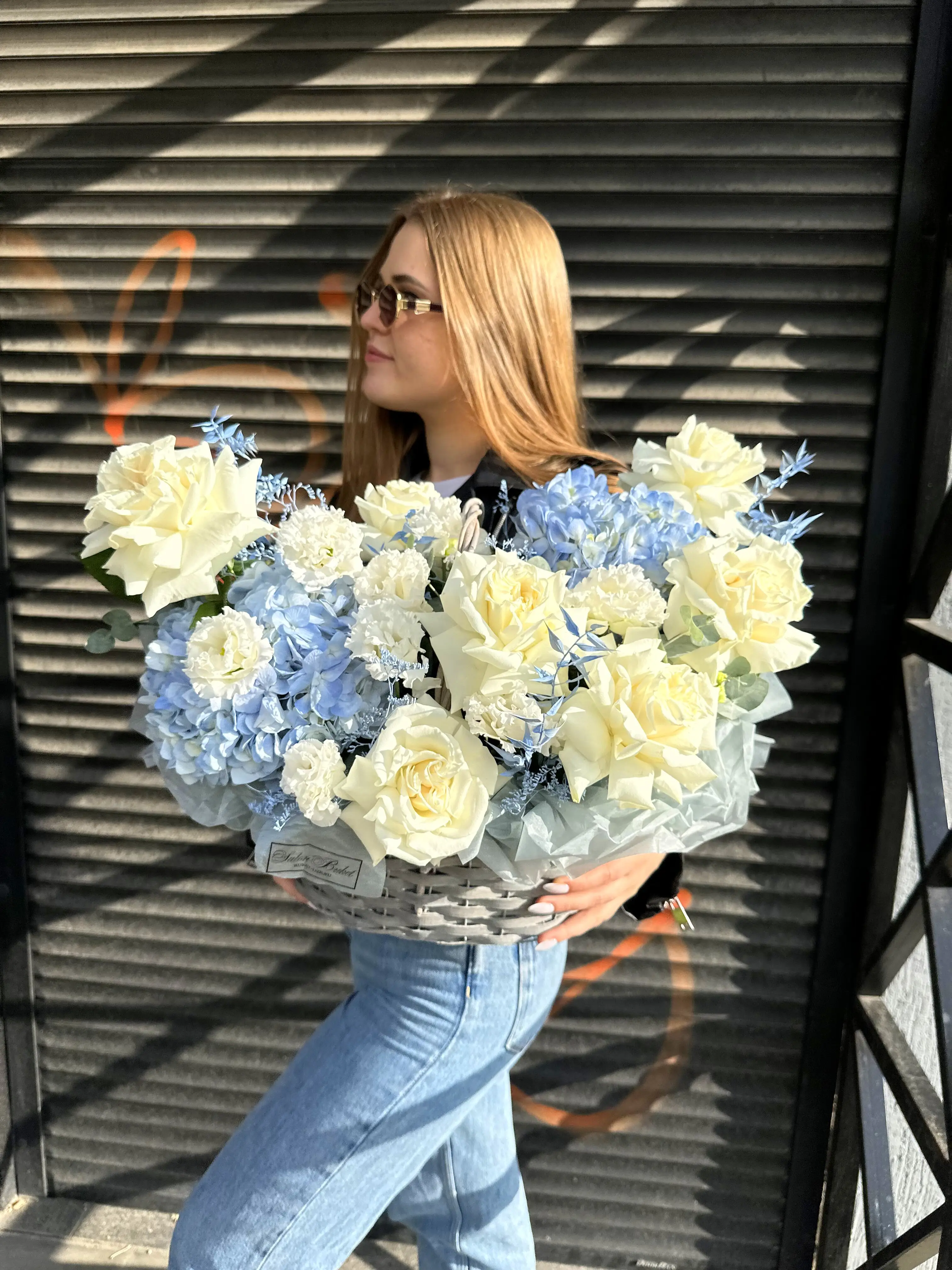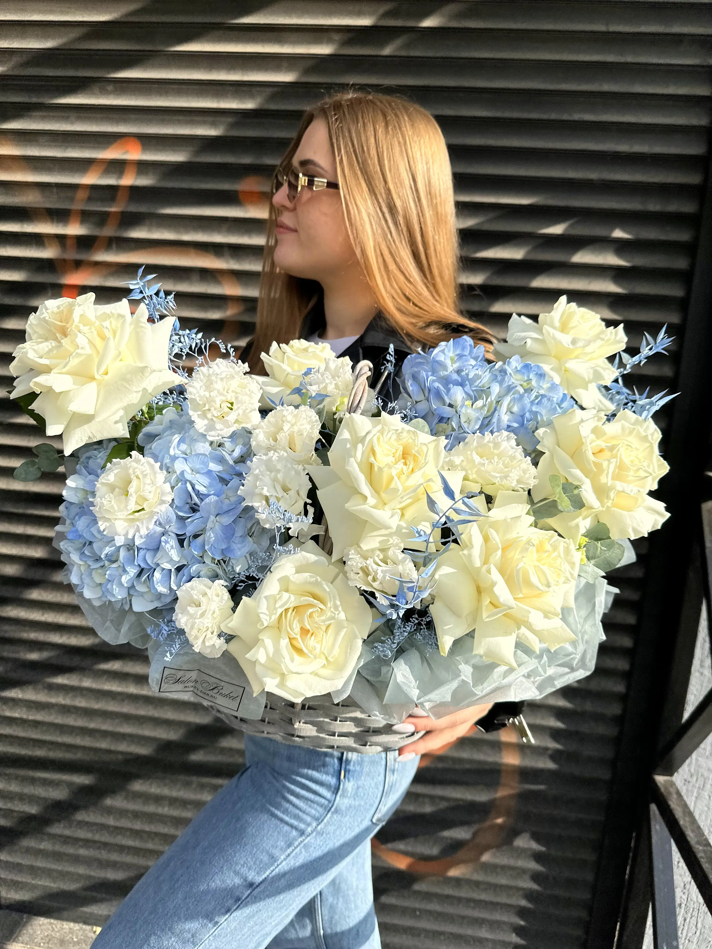 На фото - Корзина с цветами - розы пионовидные и голубая гортензия . В составе данной композиции: Гортензия - 2 шт,