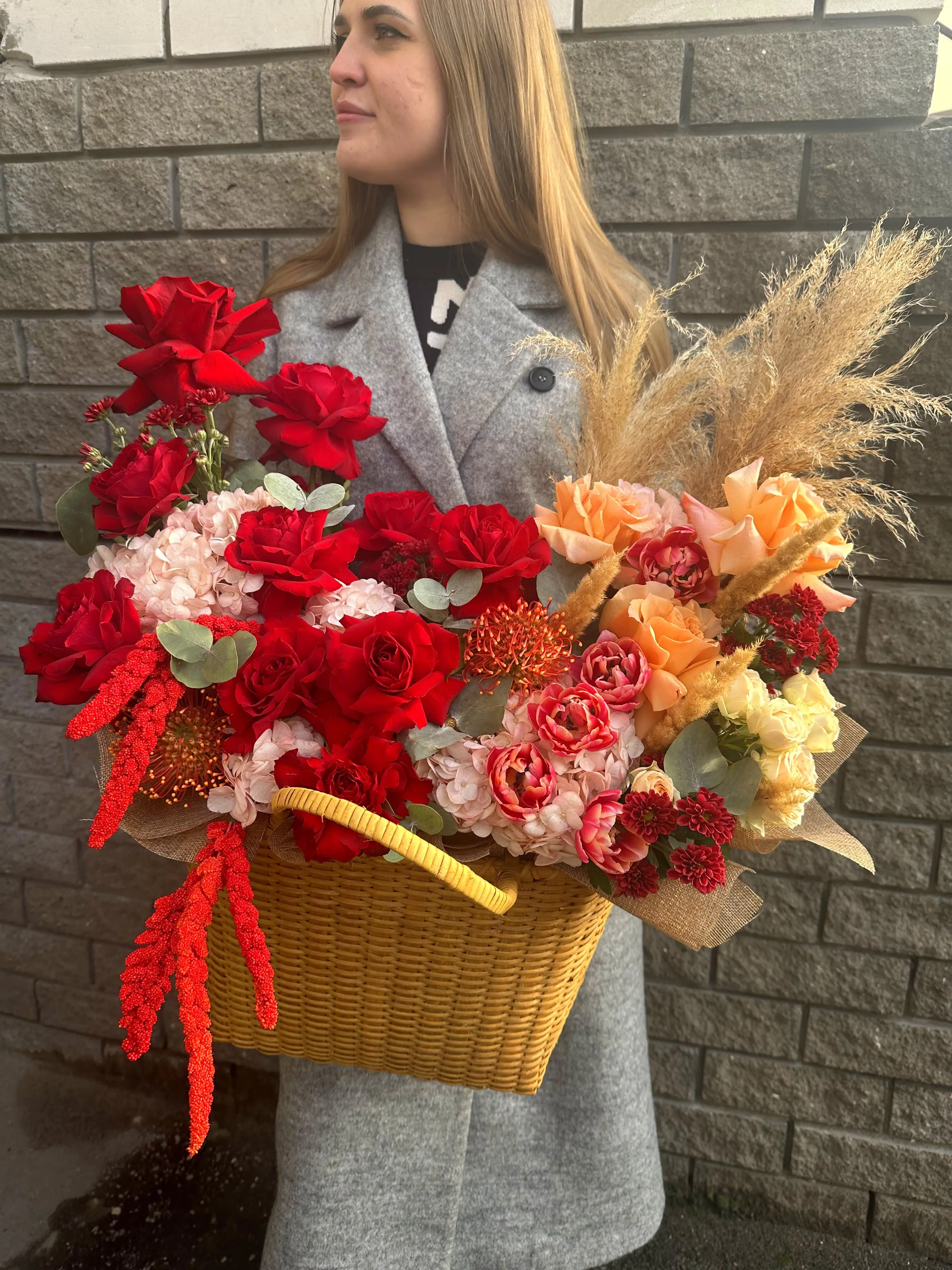 На фото - Корзина с розами и тюльпанами . В составе данной композиции: Гортензия - 2 шт,