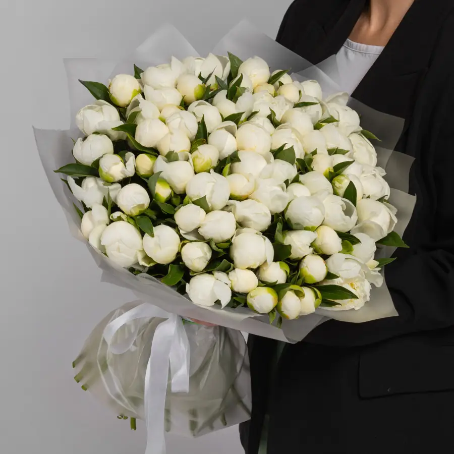 51 Белый Пион в упаковке — отличный выбор для подарка! На сайте вы найдете красочные фотографии, которые помогут сделать выбор. Цена букета — 34160 руб.. Закажите 51 Белый Пион в упаковке с доставкой в Дзержинске и по области.