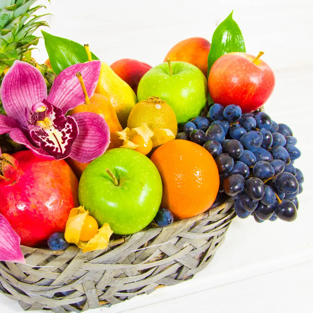 Зарядитесь витаминами из сочных фруктов! Порадуйте любимых бесплатной доставкой подарочной корзины с фруктами и цветами. Прекрасный состав этой корзины, в которой найдется лакомство на любой вкус: и ананас, и нектарины, и апельсины, кисть сочного винограда и полный витамина С гранат.