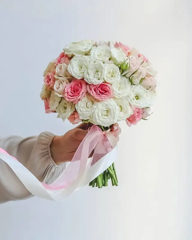 На фото - Свадебный букет с розами. В составе данной композиции: Роза Кустовая - 15 шт, Лента атласная, . На сайте buket-dzr.ru Вы найдете большой выбор недорогих букетов, цветочных композиций для любого повода. У нас можно заказать Свадебный букет с розами за 4700 руб.