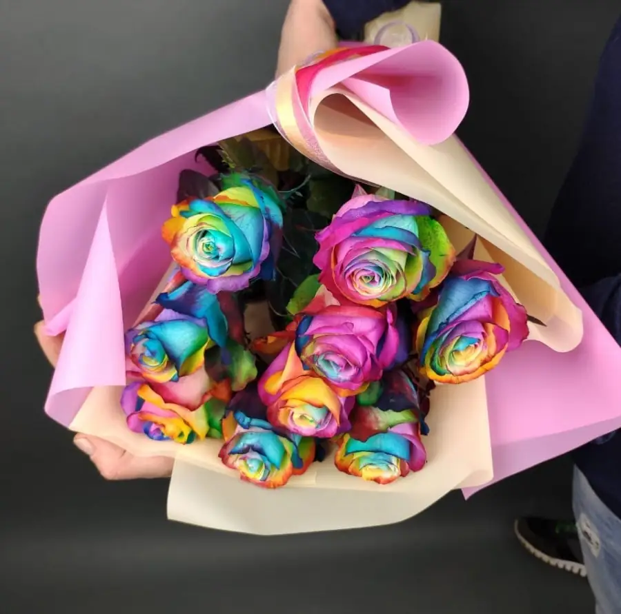 На фото - 9 Радужных Роз в дизайнерской упаковке . В составе данной композиции: Роза - 9 шт,