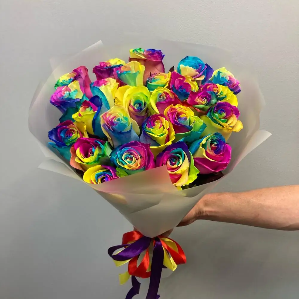 На фото - 25 радужных роз в упаковке. В составе данной композиции: Роза - 25 шт,
