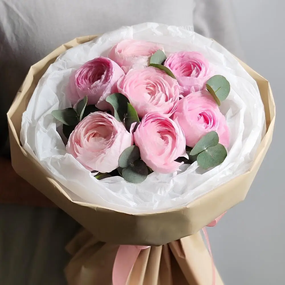 7 Розовых ранункулюсов с эвкалиптом — купить по цене от 3080 руб. с доставкой в Дзержинске