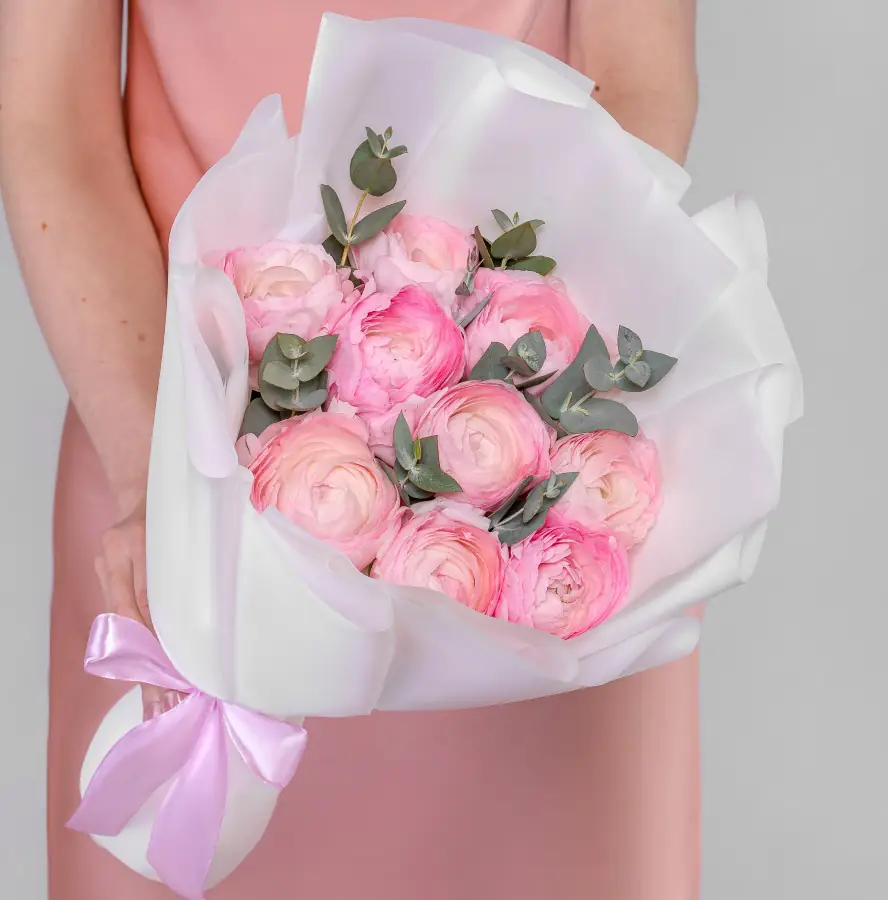 9 Розовых Ранункулюсов и Эвкалипт