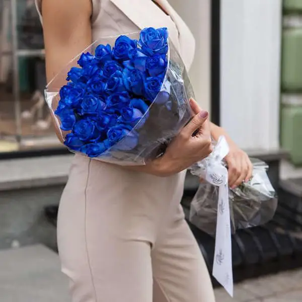 На фото - 25 Синих роз в упаковке . В составе данной композиции: Роза синяя - 15 шт,