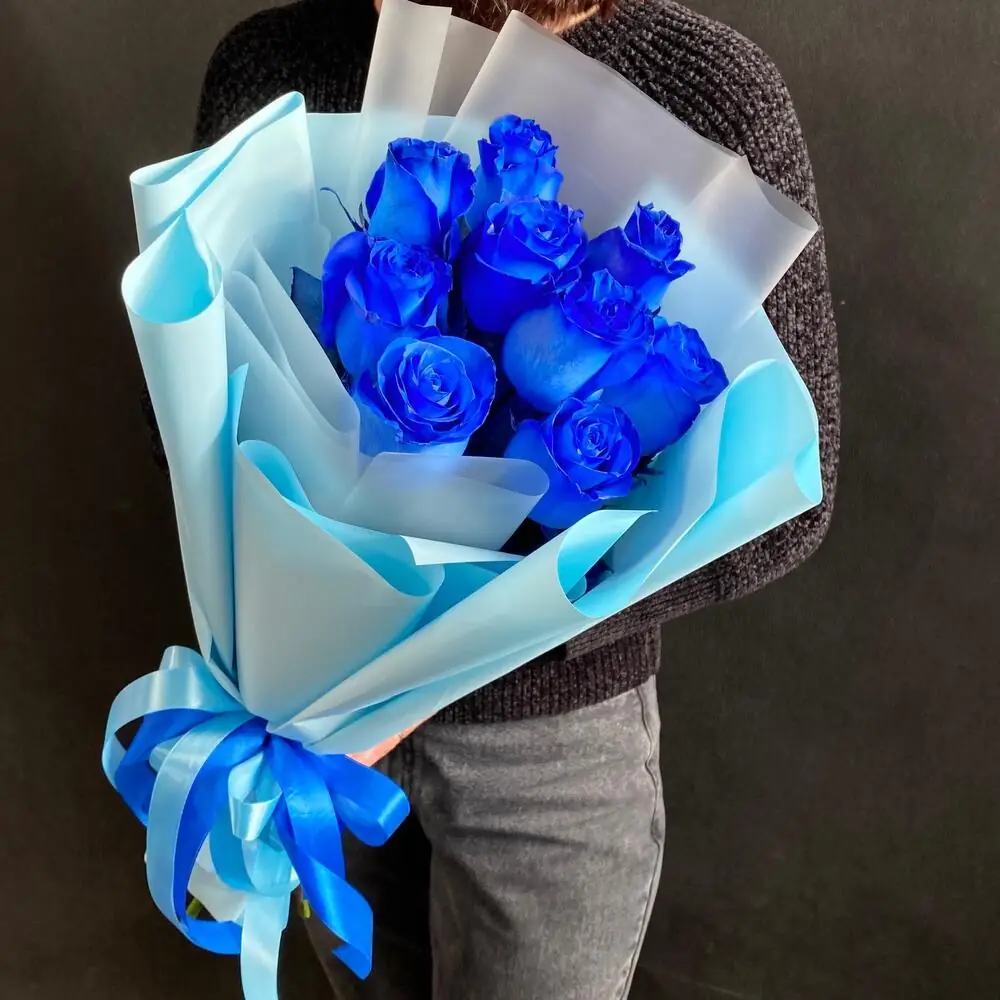 На фото - 9 Синих роз в упаковке . В составе данной композиции: Роза синяя - 9 шт,
