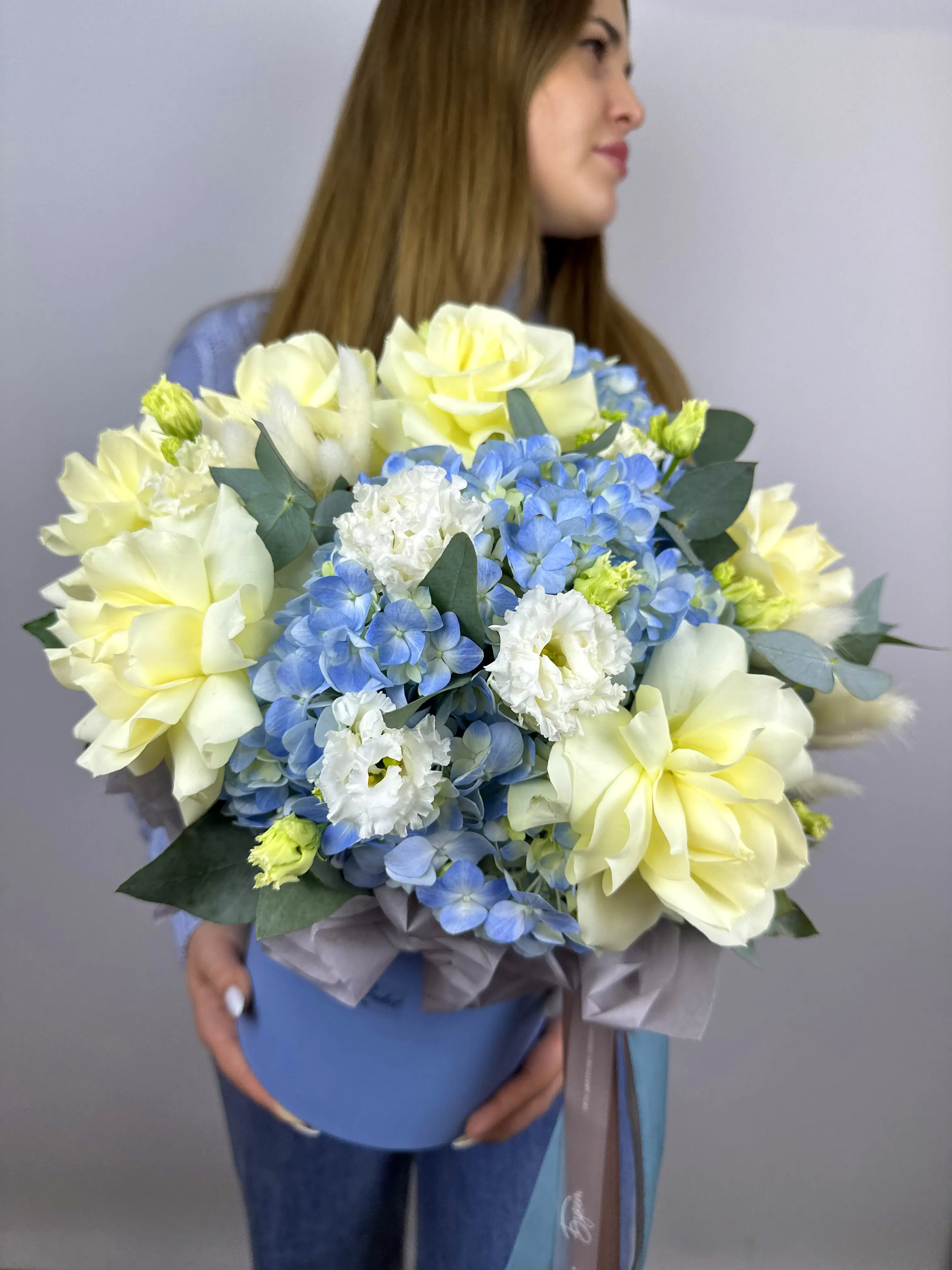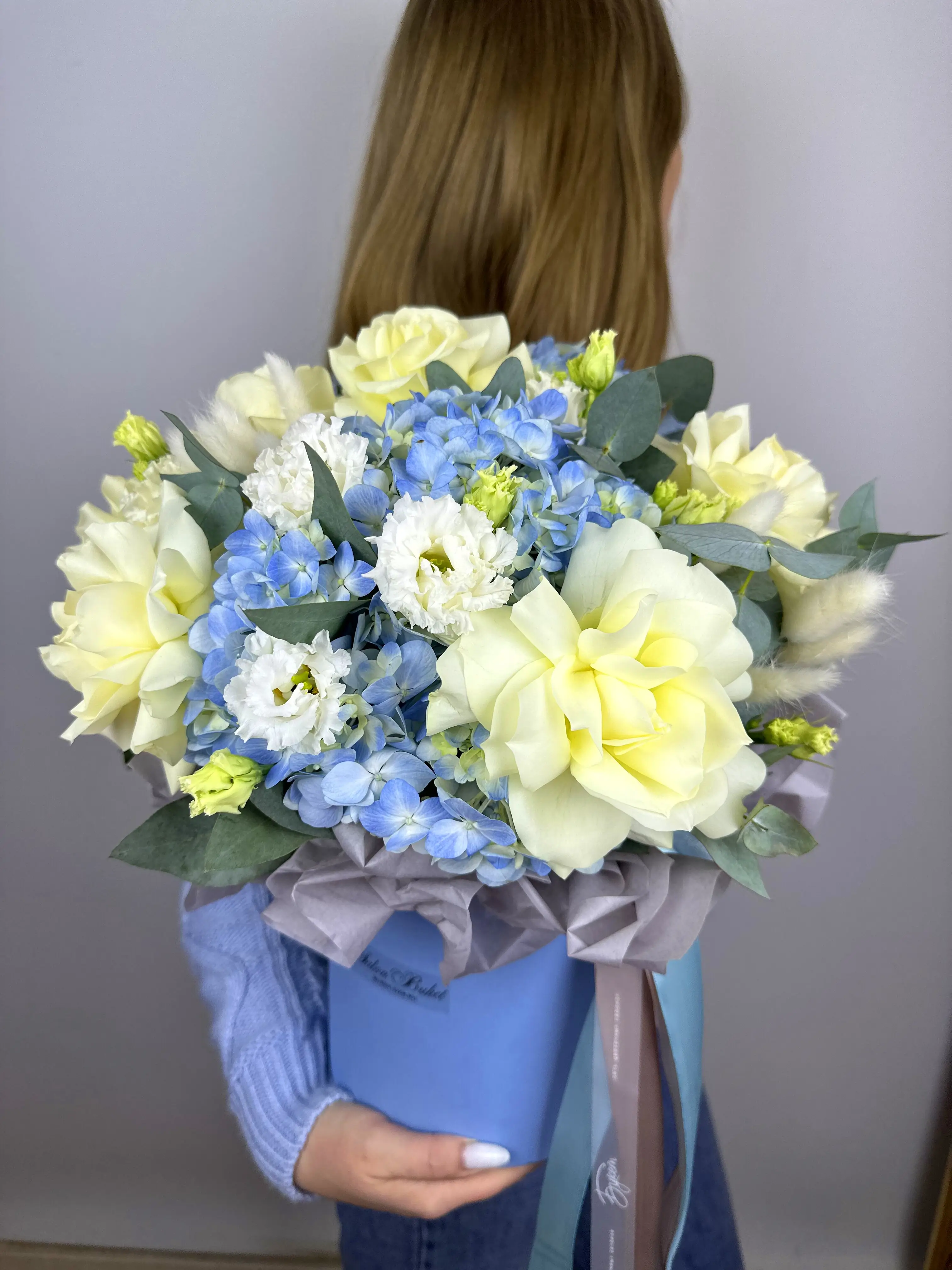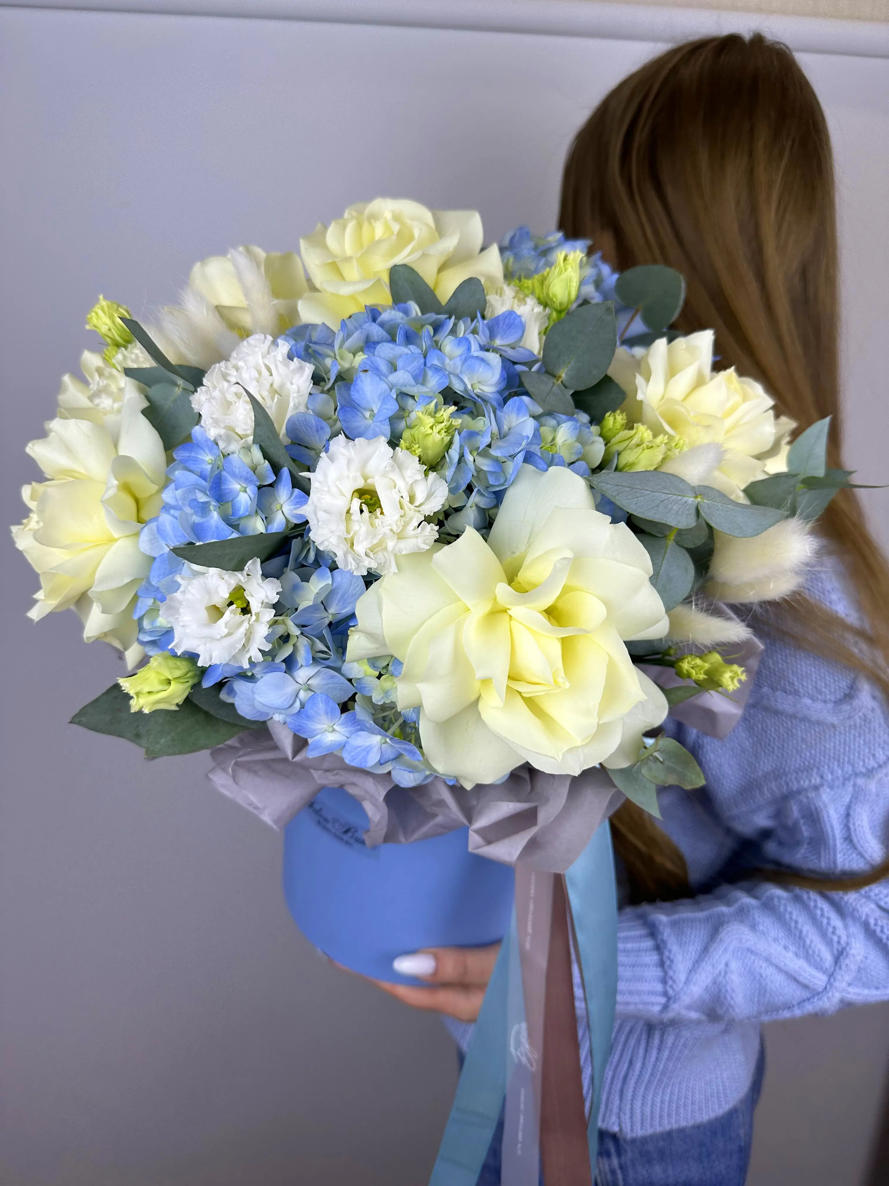 У нас можно заказать Голубая композиция с гортензией и розами за 5599 руб. с доставкой Дзержинске и по области