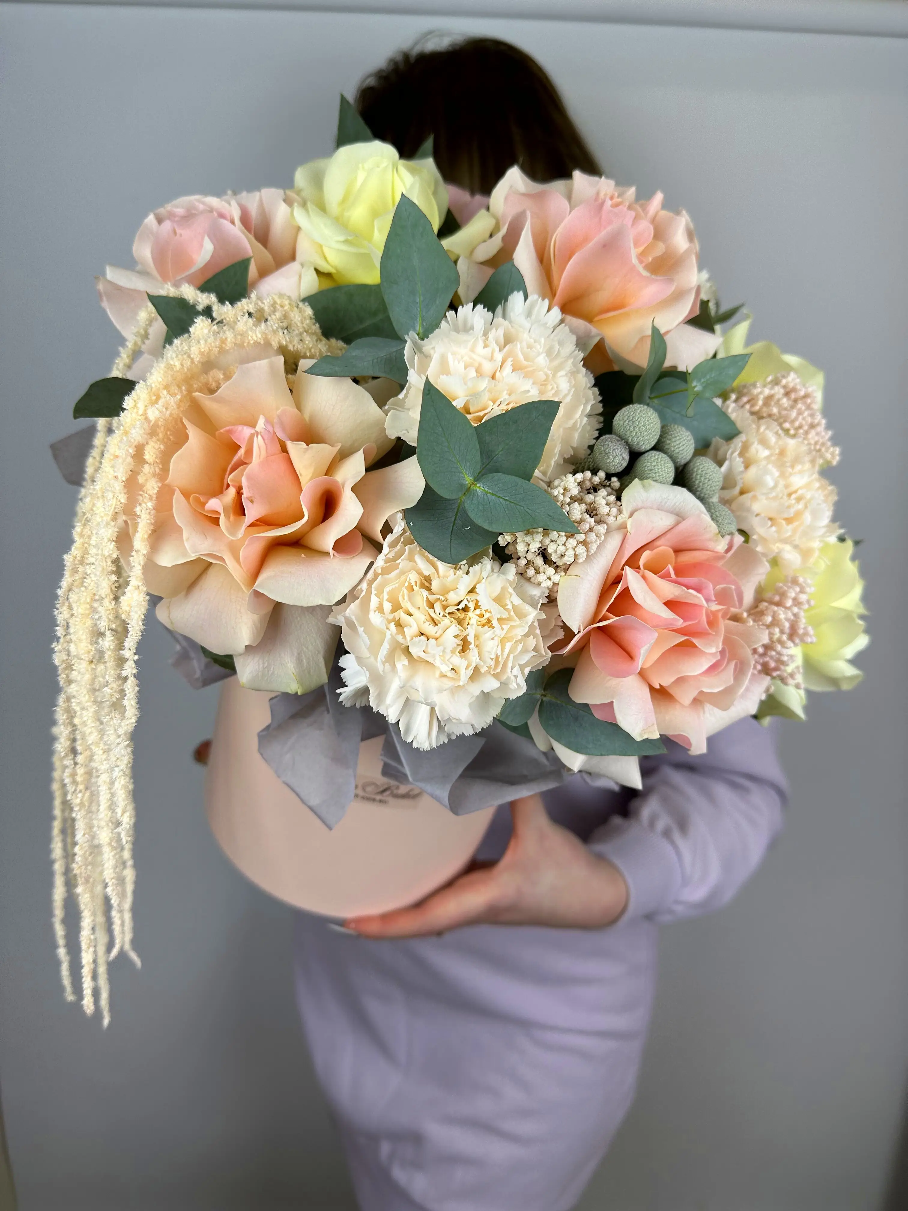 На фото - Коробка с розами и гвоздикой . В составе данной композиции: Роза Кенийская - 5 шт,