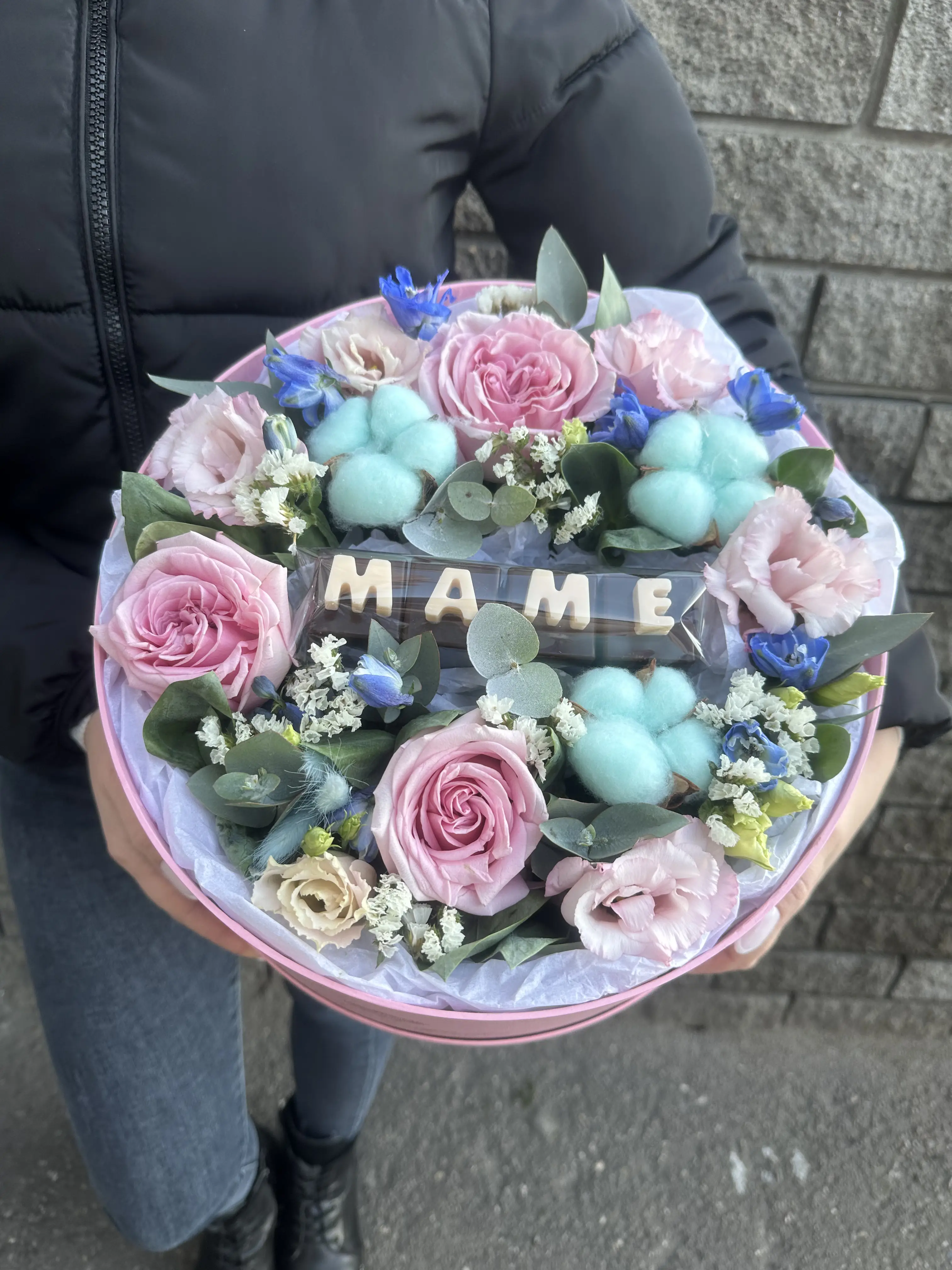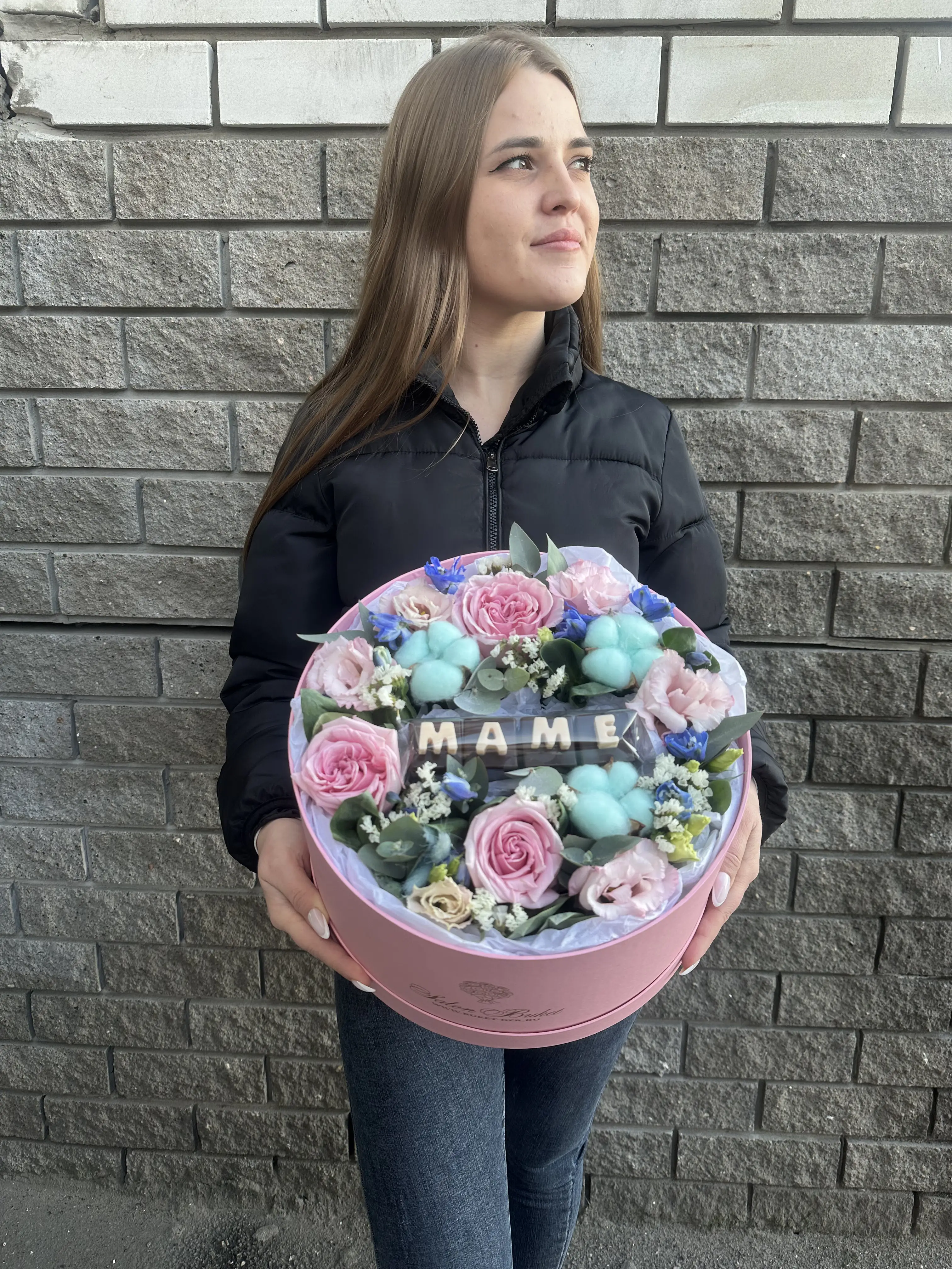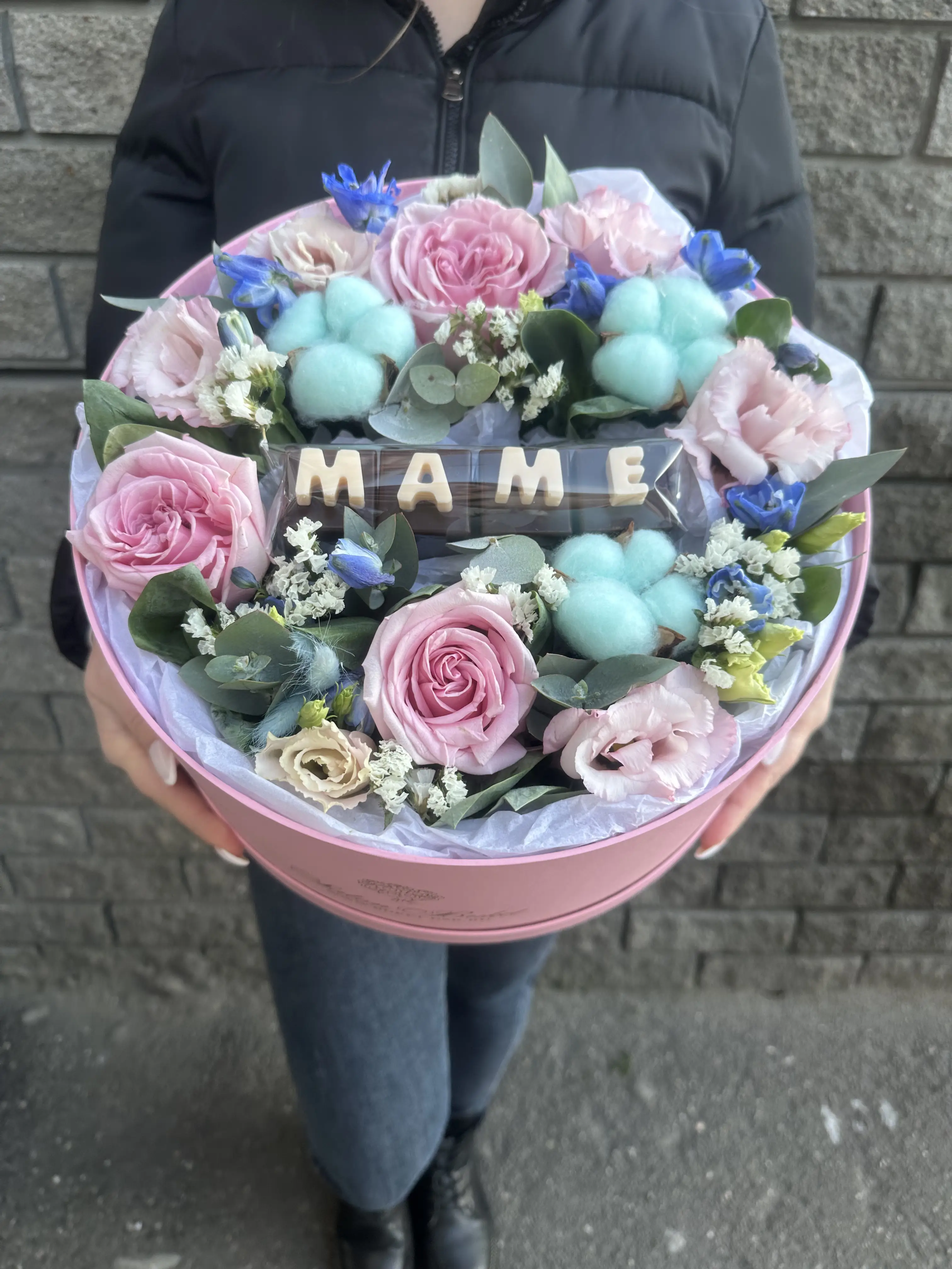 На фото - Шляпная коробка "Моей маме" . В составе данной композиции: Роза розовая - 3шт,