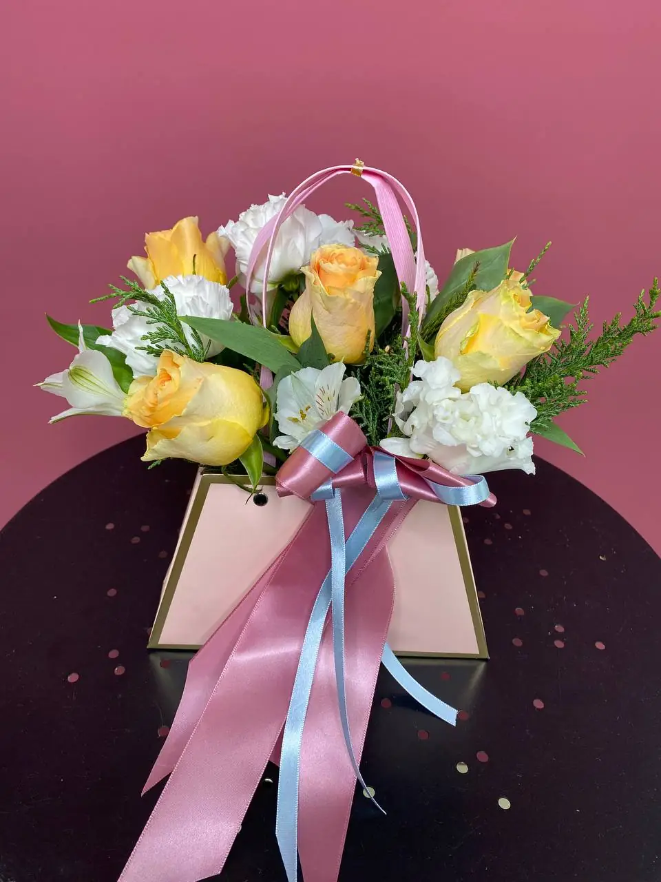 На фото - Цветочная композиция с розой и эустомой . В составе данной композиции: Роза Кенийская - 5 шт.,