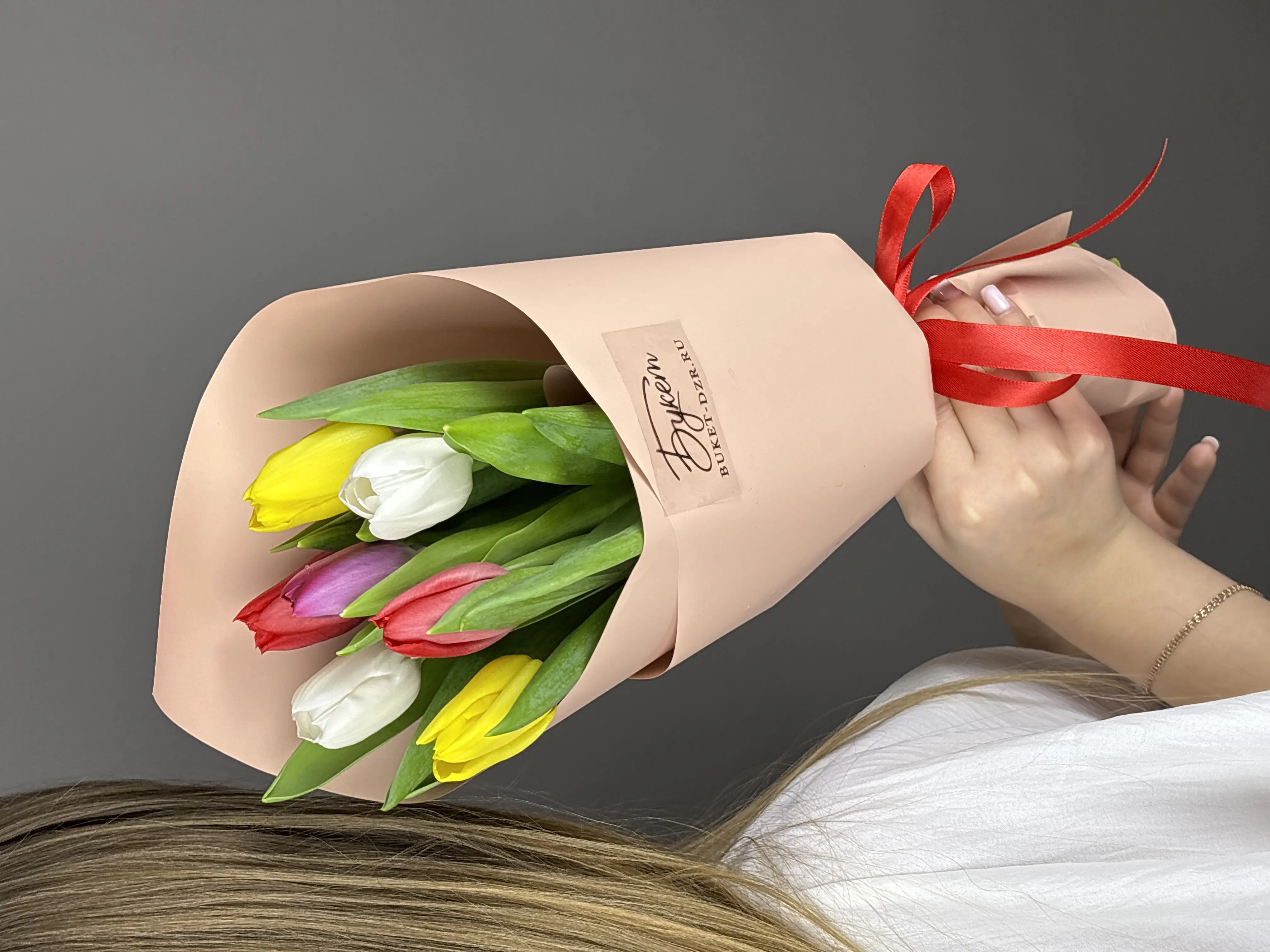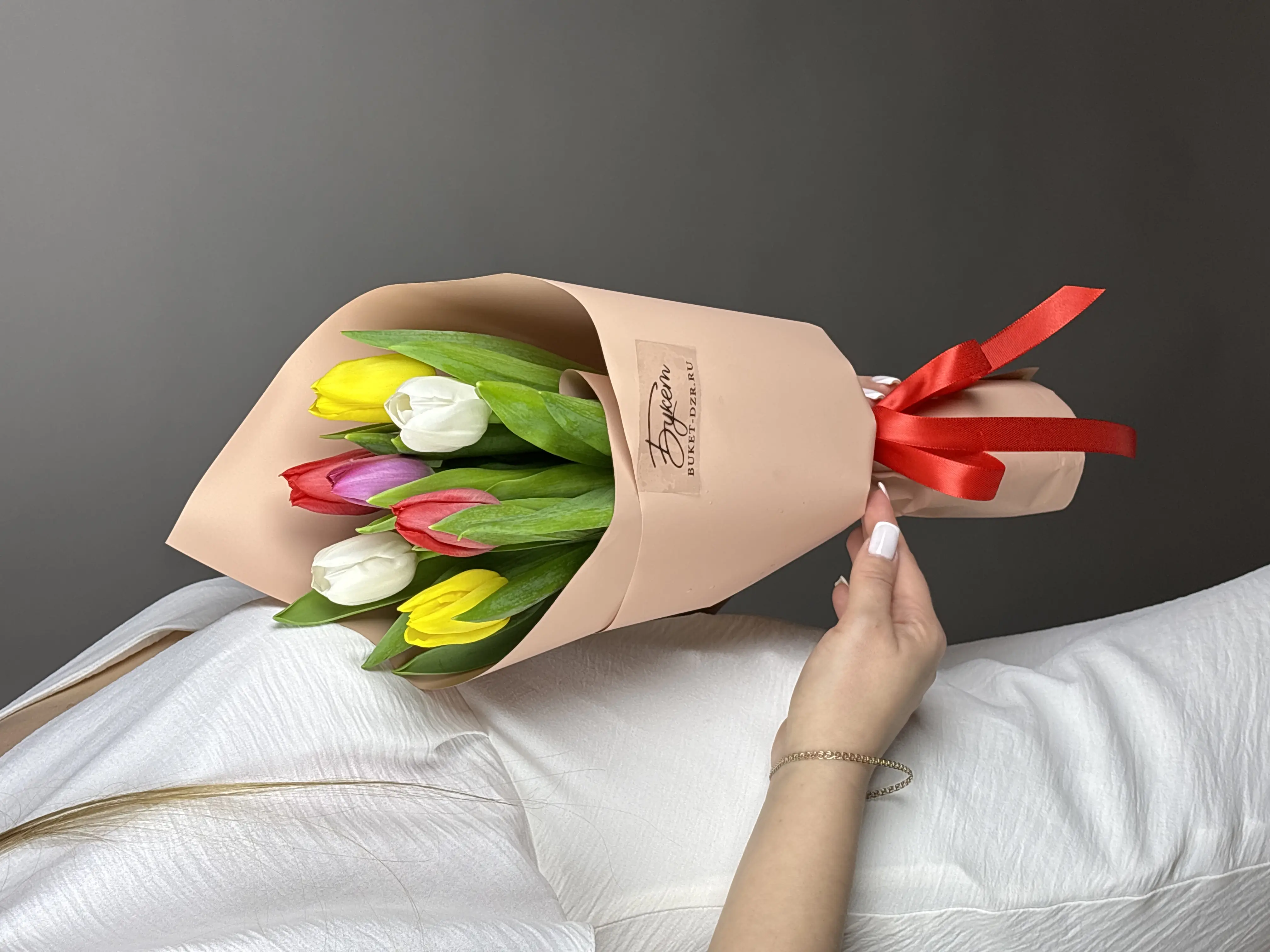 На фото - 7 Разноцветных тюльпанов в упаковке. В составе данной композиции: Тюльпан - 7шт,