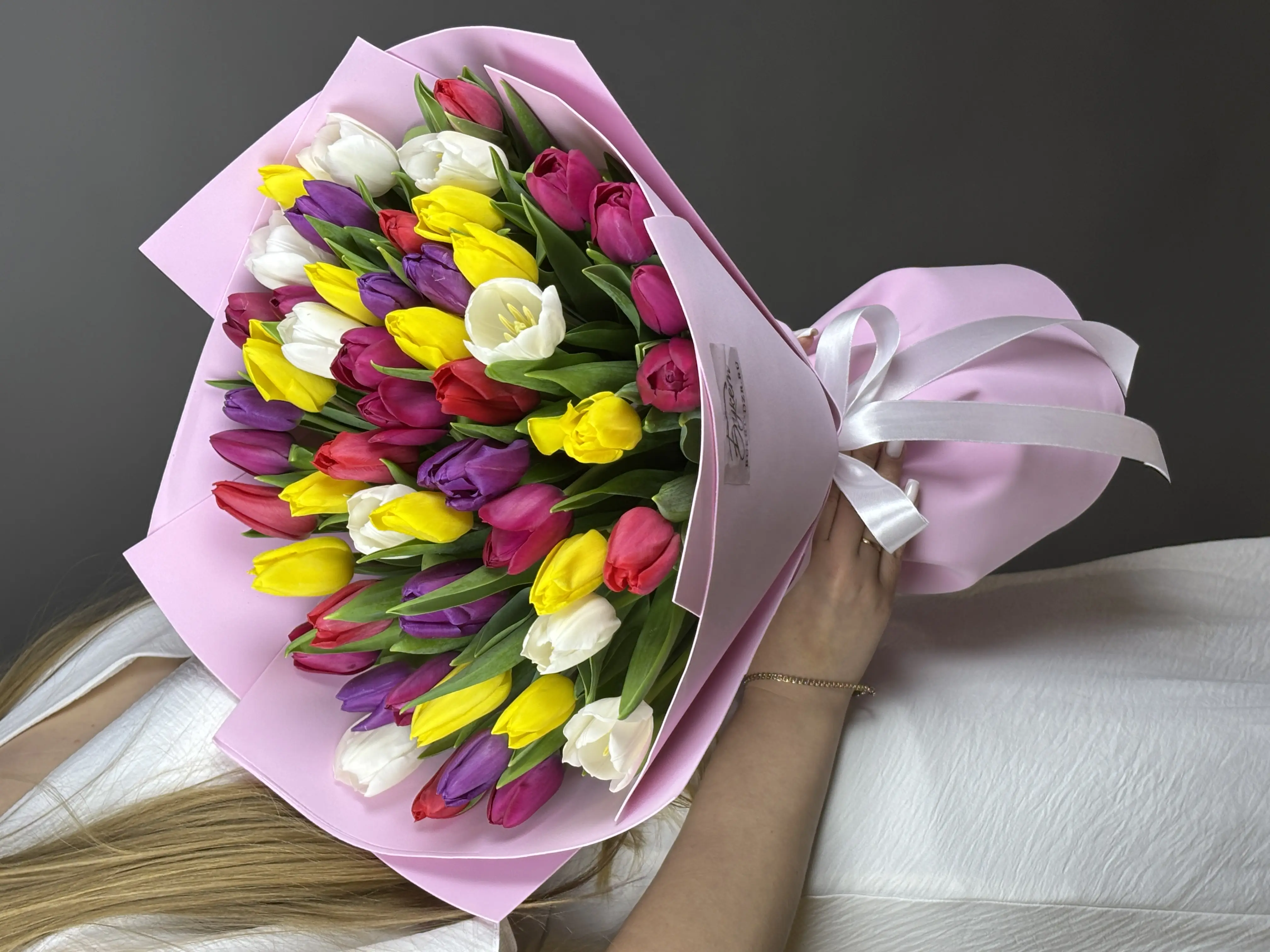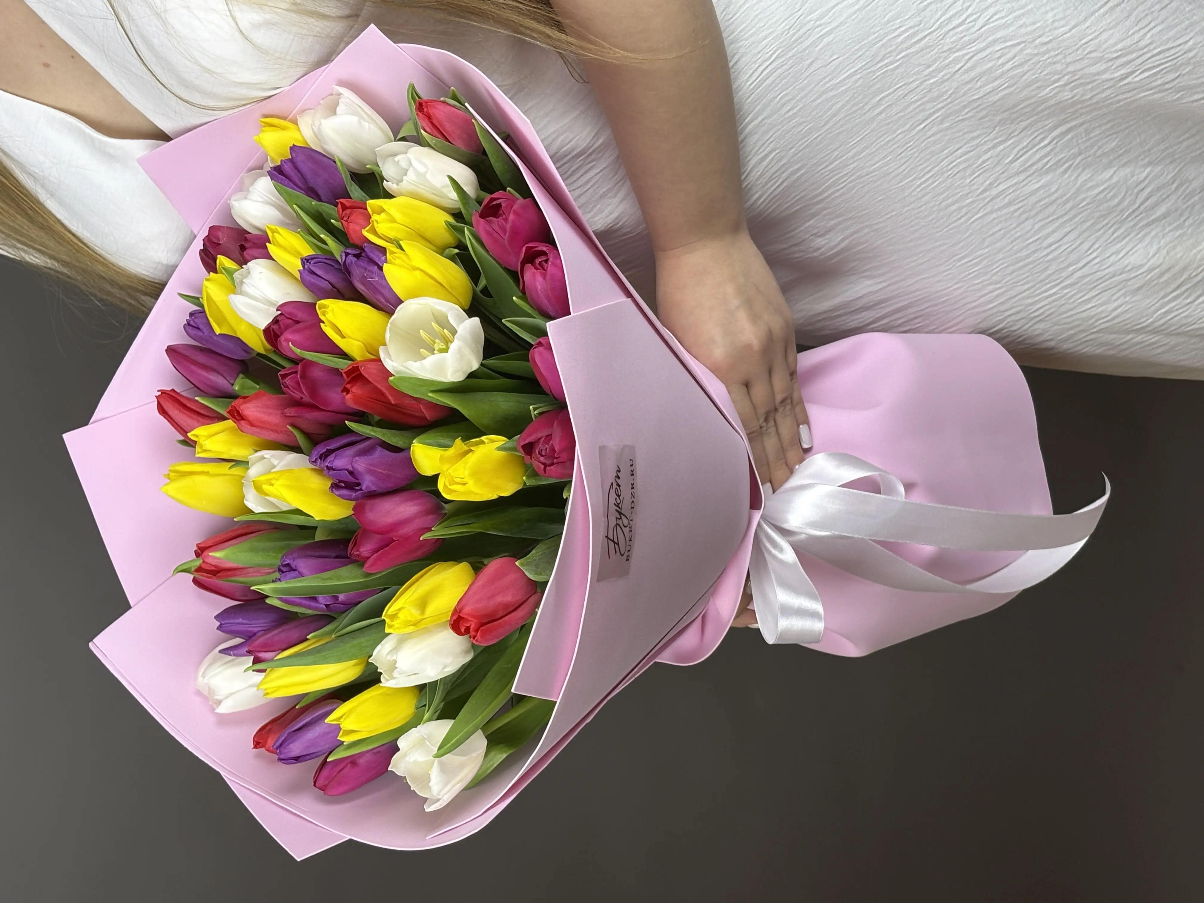 На фото - Букет из 51 разноцветного тюльпана . В составе данной композиции: Тюльпан - 51 шт,