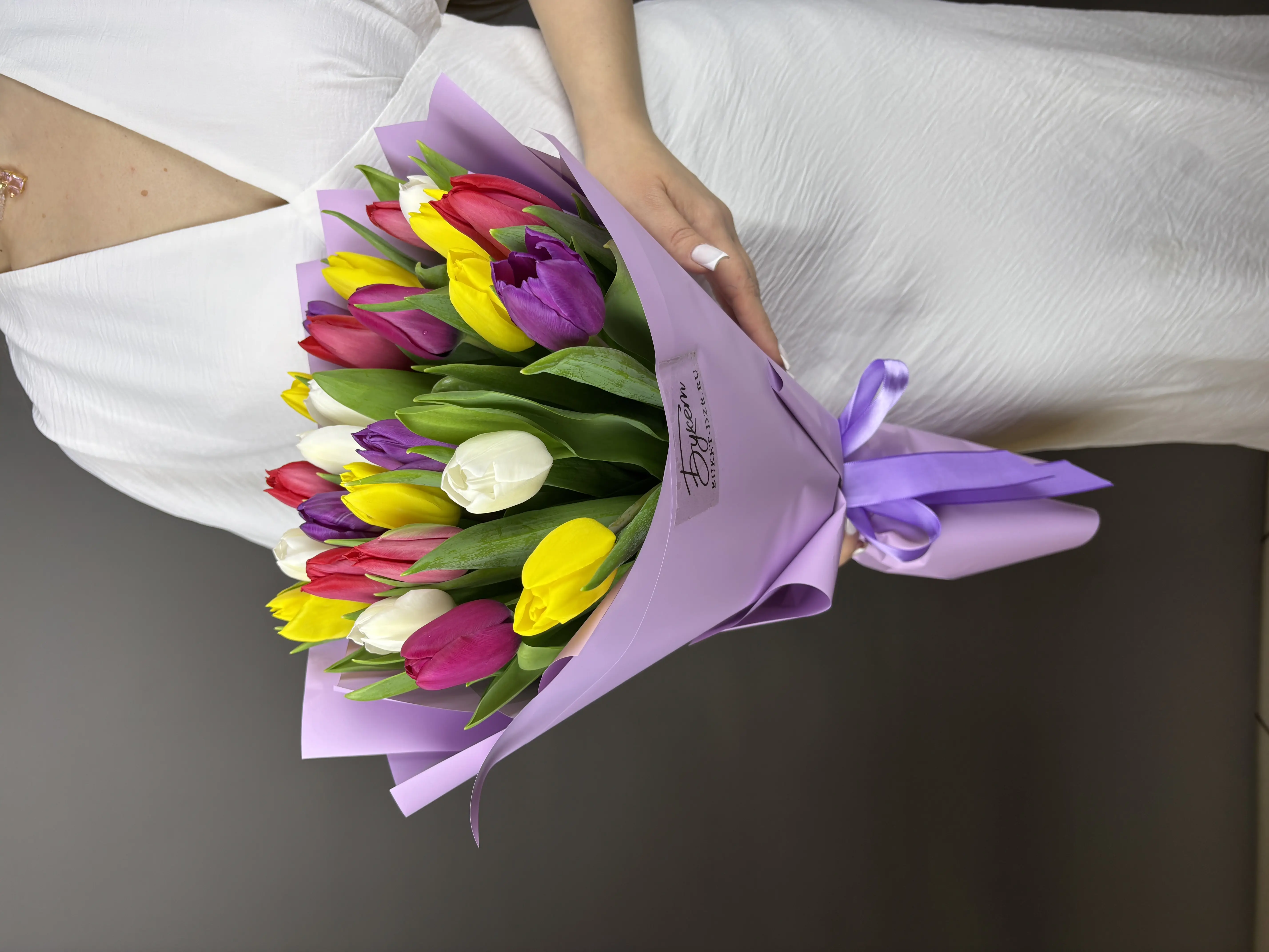 На фото - 25 Разноцветных тюльпанов. В составе данной композиции: Тюльпан нежный микс 25шт,