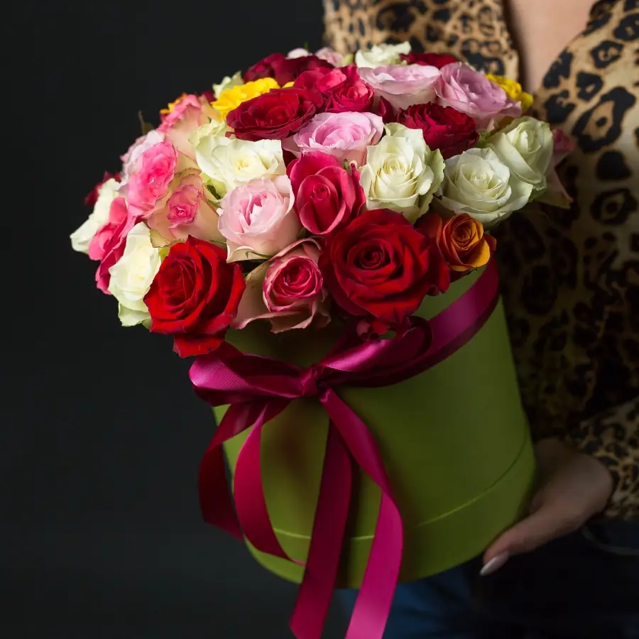 На фото - 55 Роз Микс (30-40 см.) в коробке . В составе данной композиции: Роза 40 см - 55 шт.,