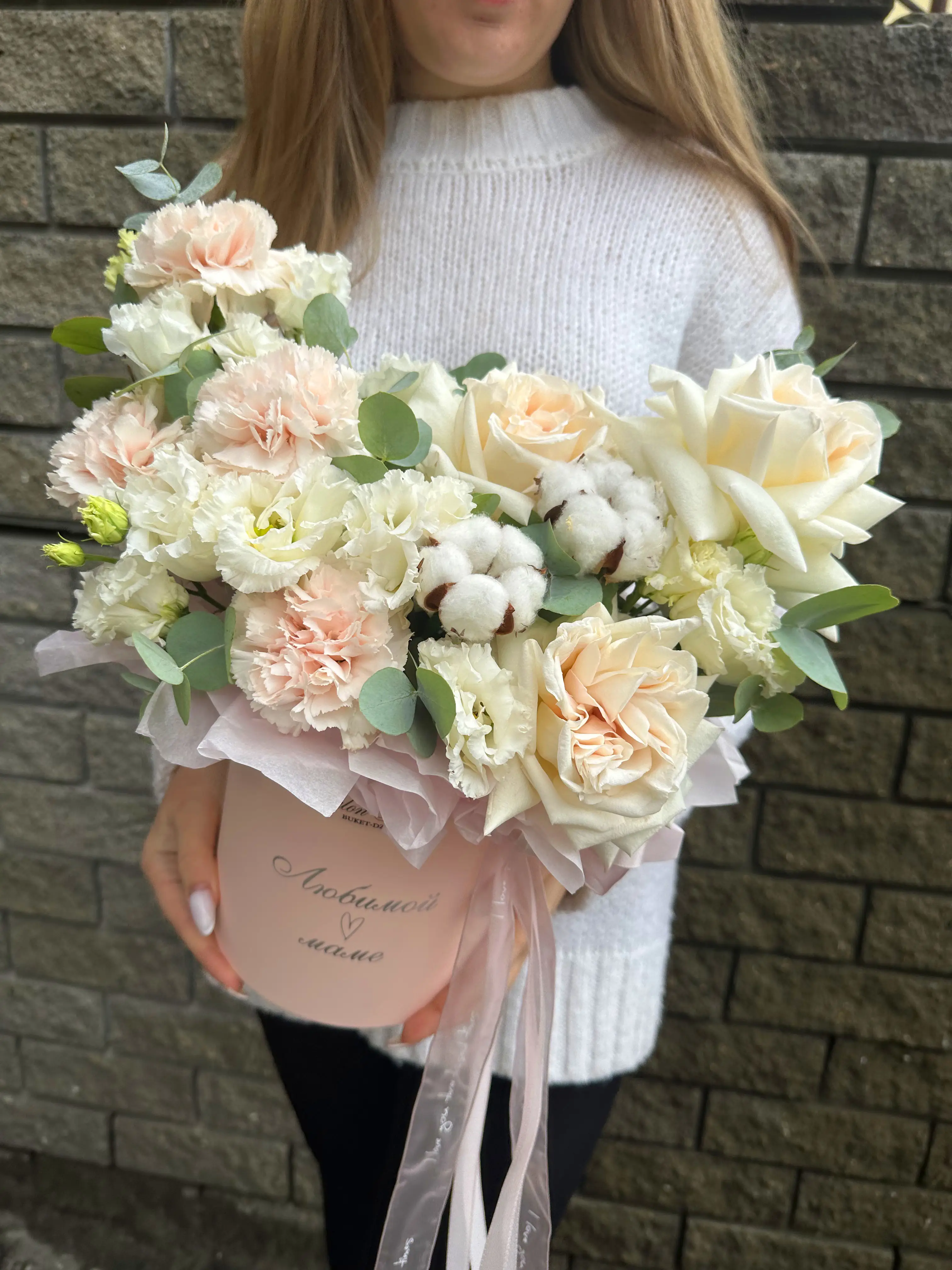 У нас можно заказать Нежная композиция с розами и хлопком за 4275 руб. с доставкой Дзержинске и по области