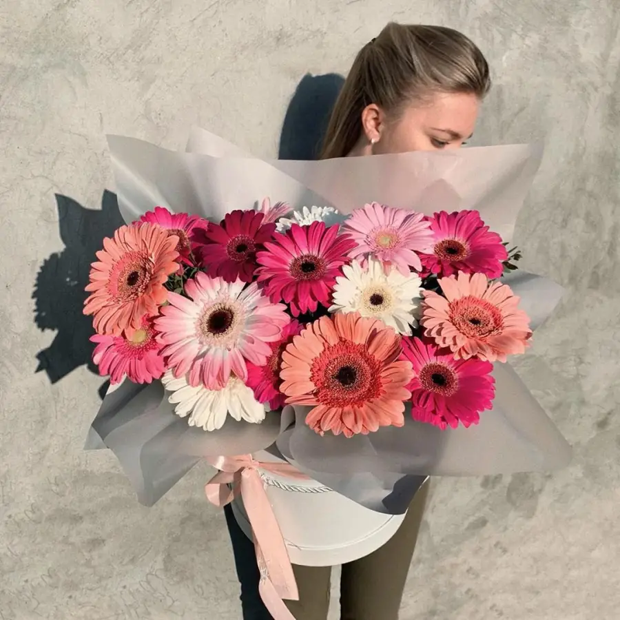 На фото - Шляпная коробка "17 Гербер" . В составе данной композиции: Гербера Микс - 17 шт.,