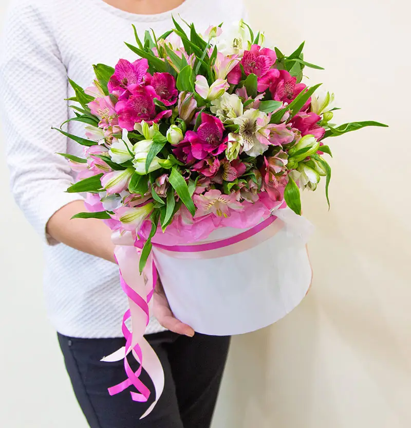 На фото - Шляпная коробка "Нежные чувства" . В составе данной композиции: Альстромерия - 13 шт.,