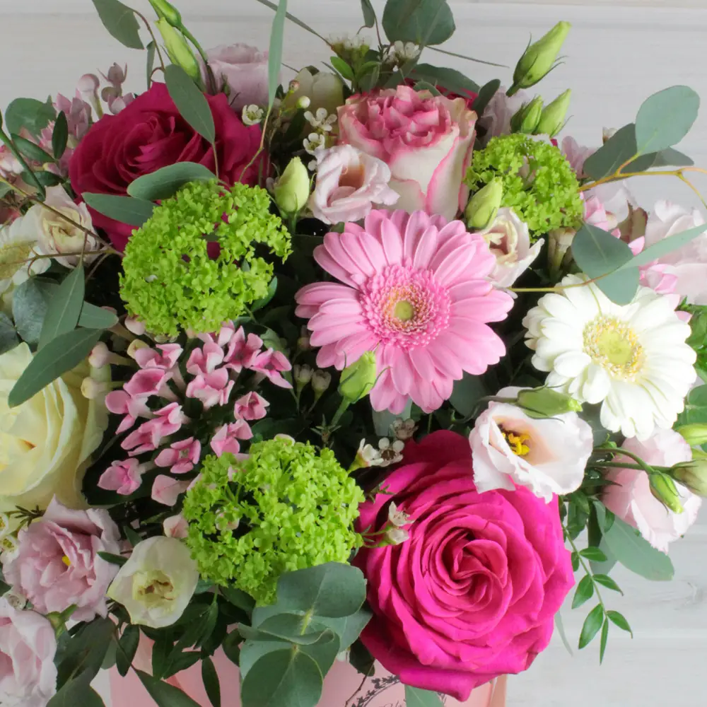 Посмотрите какие прекрасные эквадорские розы сорта Pink Floyd собраны в этом букете! Как они дополнены нежными мини-гербами и лизиантусом. Зеленые шапки вибурнума и веточки эвкалипта оттеняют всю композицию. Букет собран в шляпной коробке нежно-розового цвета и стоит в пропитанной водой губке.