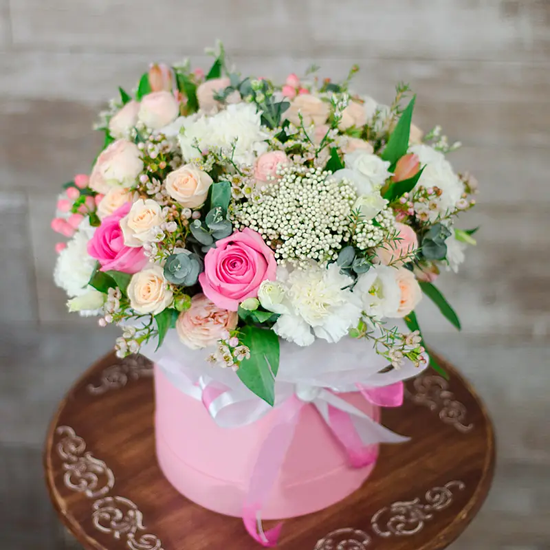 Композиция в нежных розовых тонах собрана в шляпной коробке в оазисе и не требует перестановки в вазу.