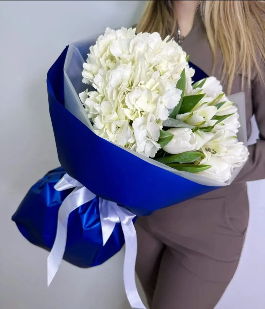 Букет с тюльпанами и гортензией - это сочетание элегантности и свежести, которое станет прекрасным подарком для любого случая.