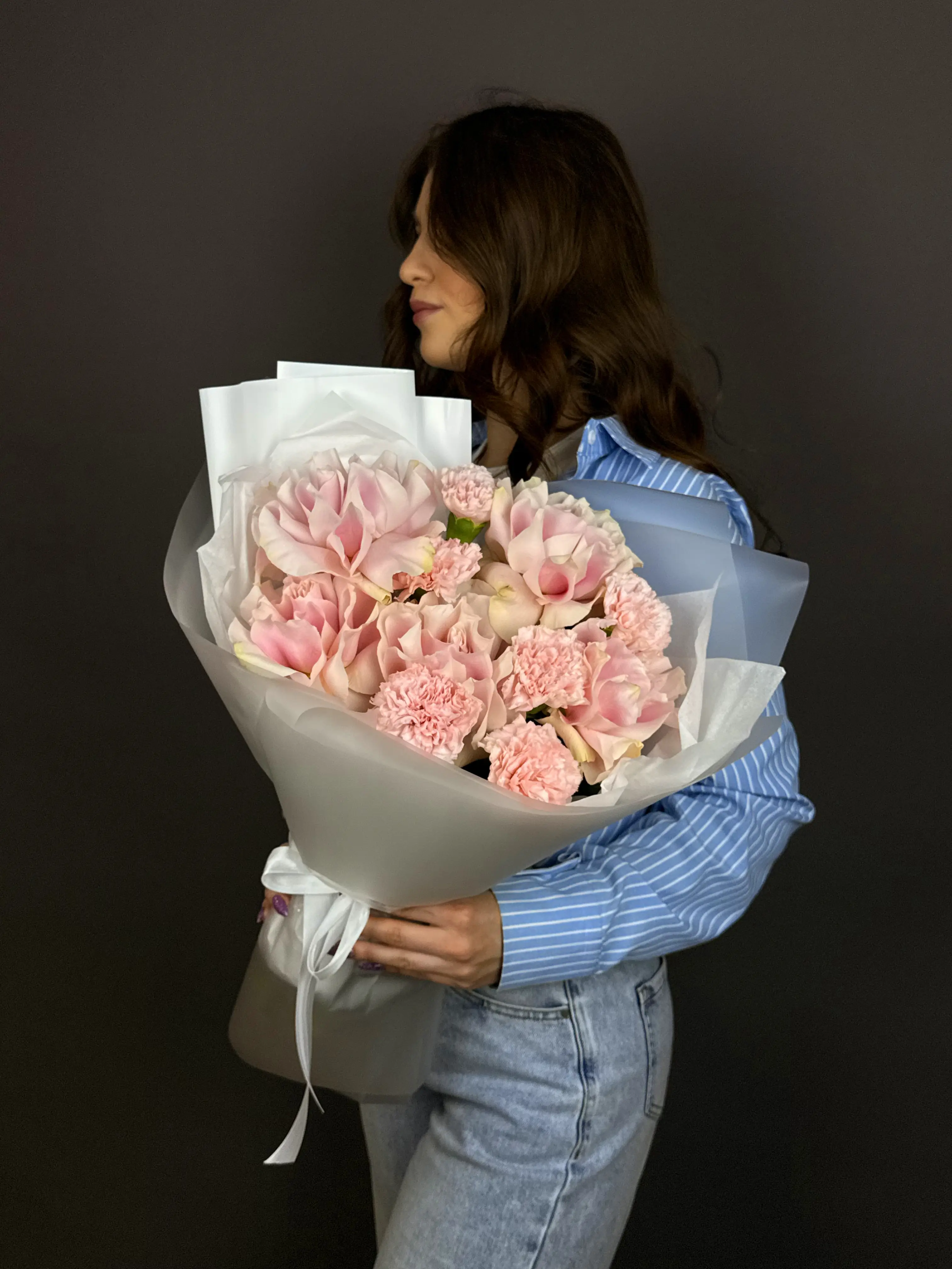Диантусы известны своей стойкостью и насыщенным ароматом, который будет радовать вас долгое время. Розы добавляют букету изысканности и элегантности, подчеркивая красоту каждого лепестка. Мы тщательно подобрали эти цветы, чтобы вы могли насладиться всей гаммой красок и запахов.