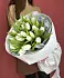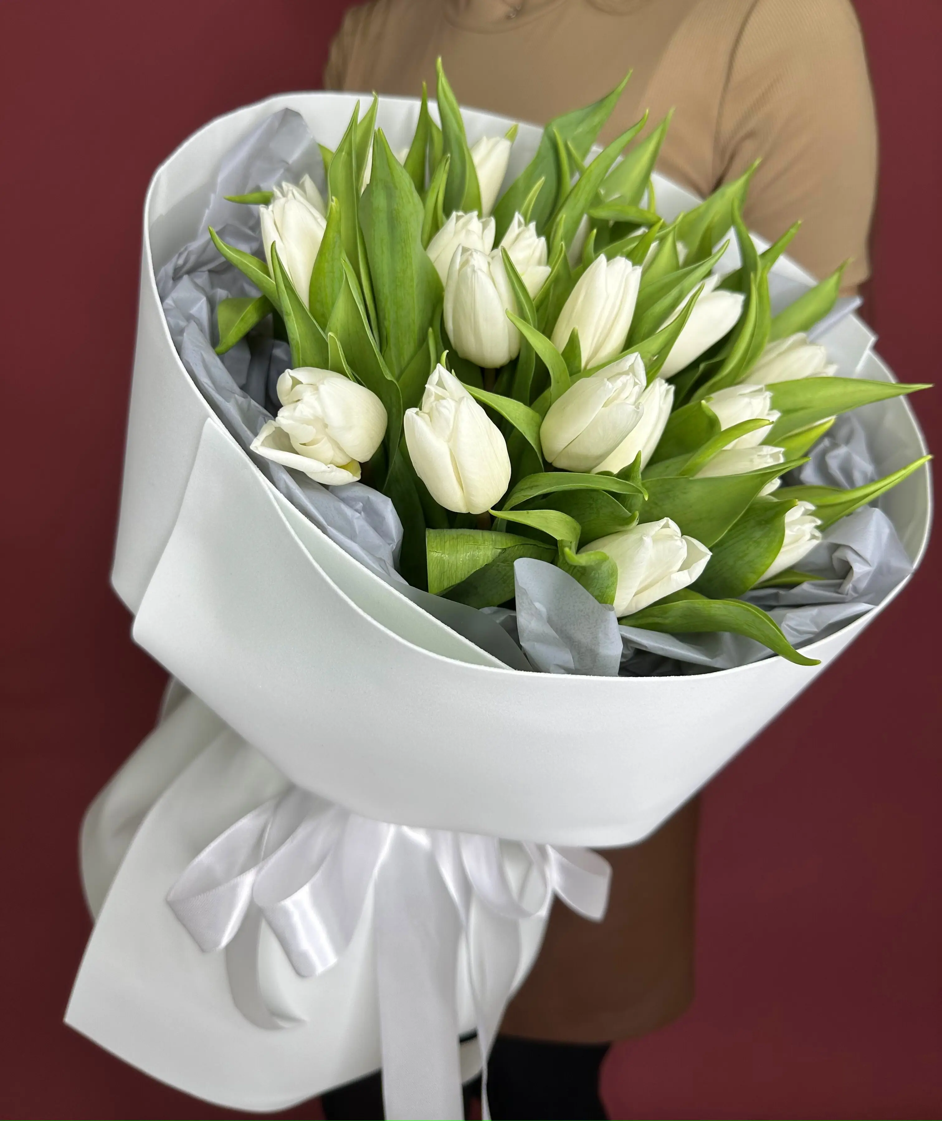 Букет живых цветов из 21 Белого тюльпана в дизайнерской упаковке – это изысканный и стильный подарок, который станет прекрасным дополнением к любому торжеству или событию.