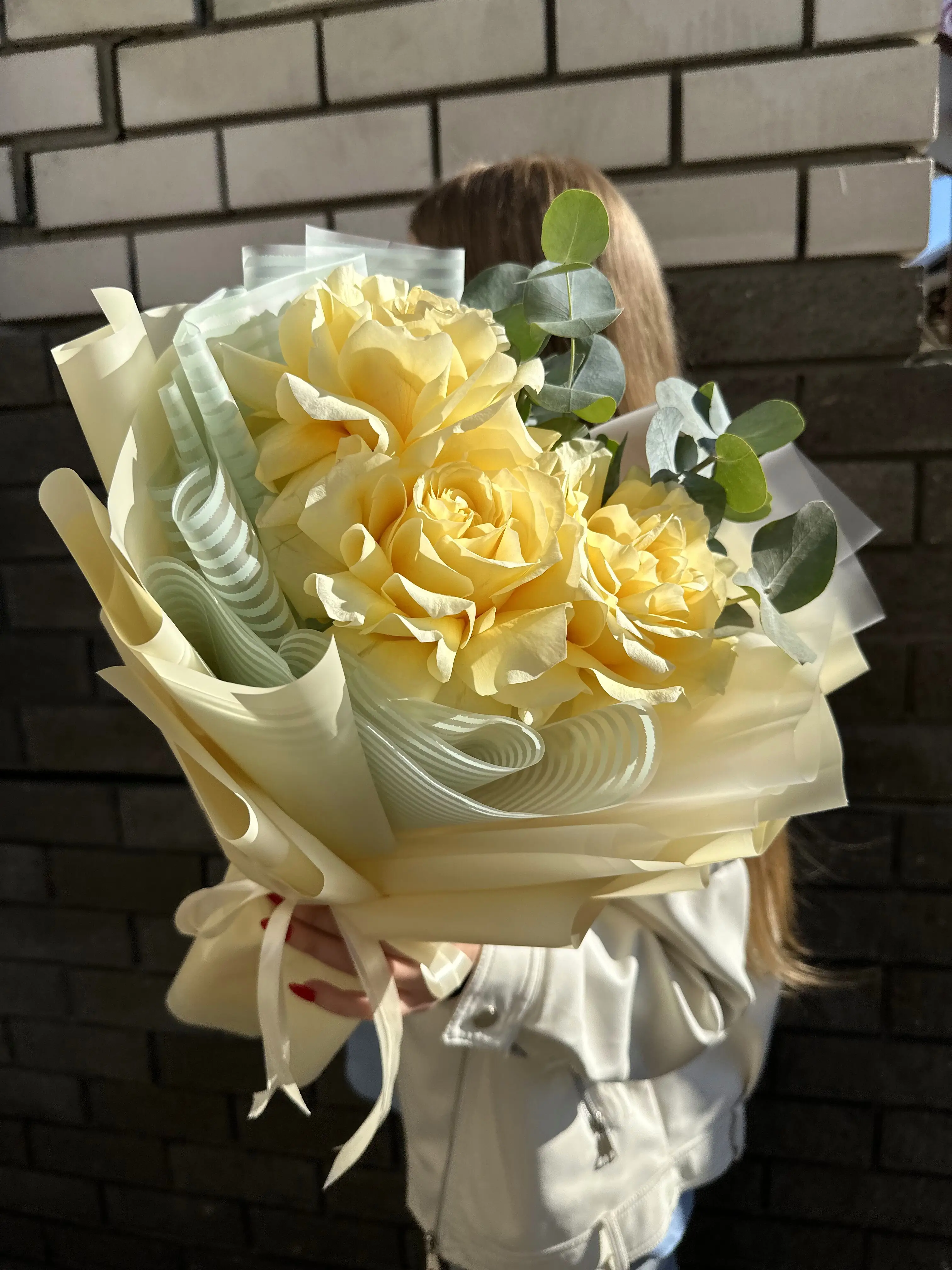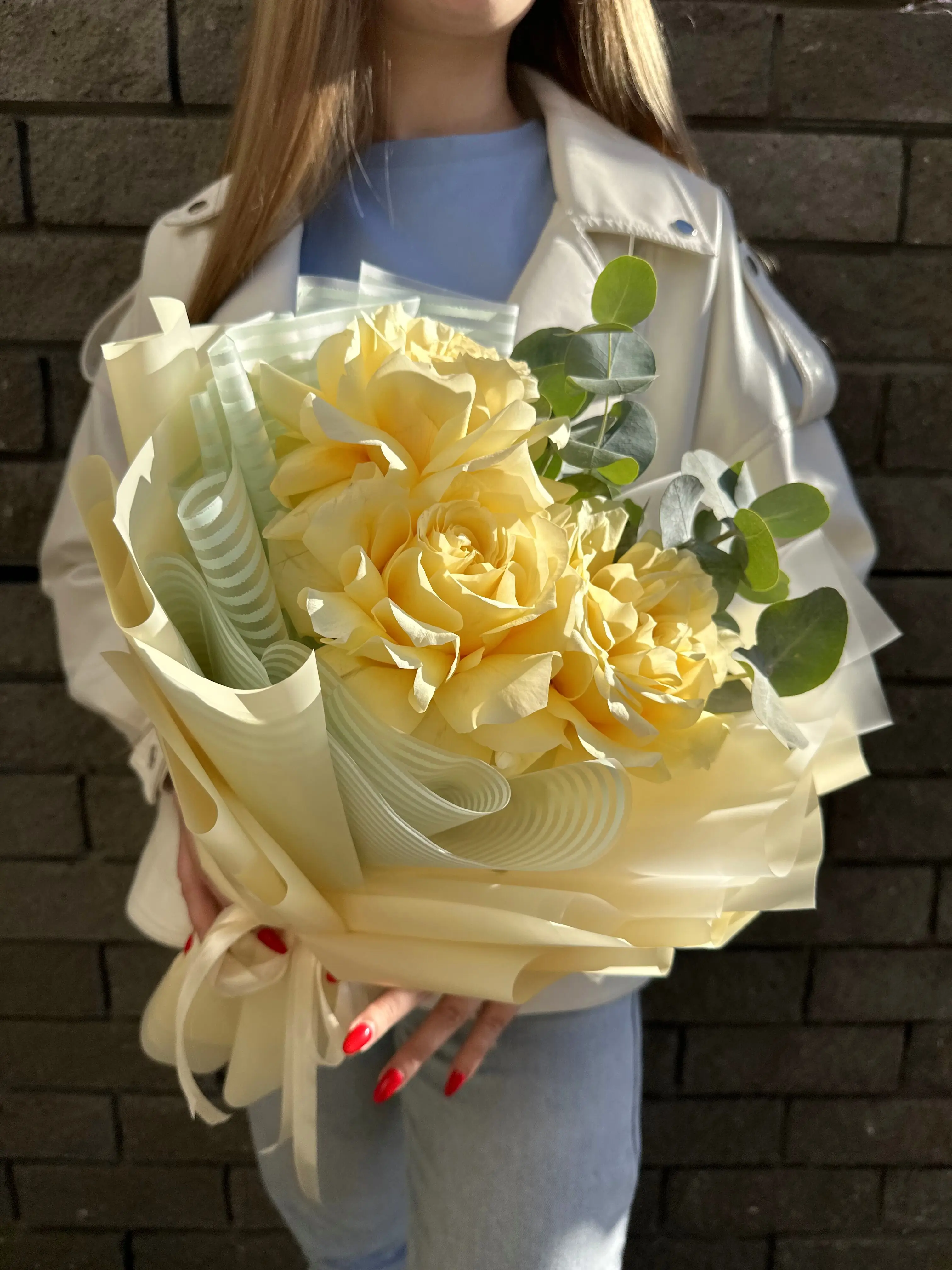 Розы в букете – это символ любви и нежности, а эвкалипт добавляет свежести и аромата.