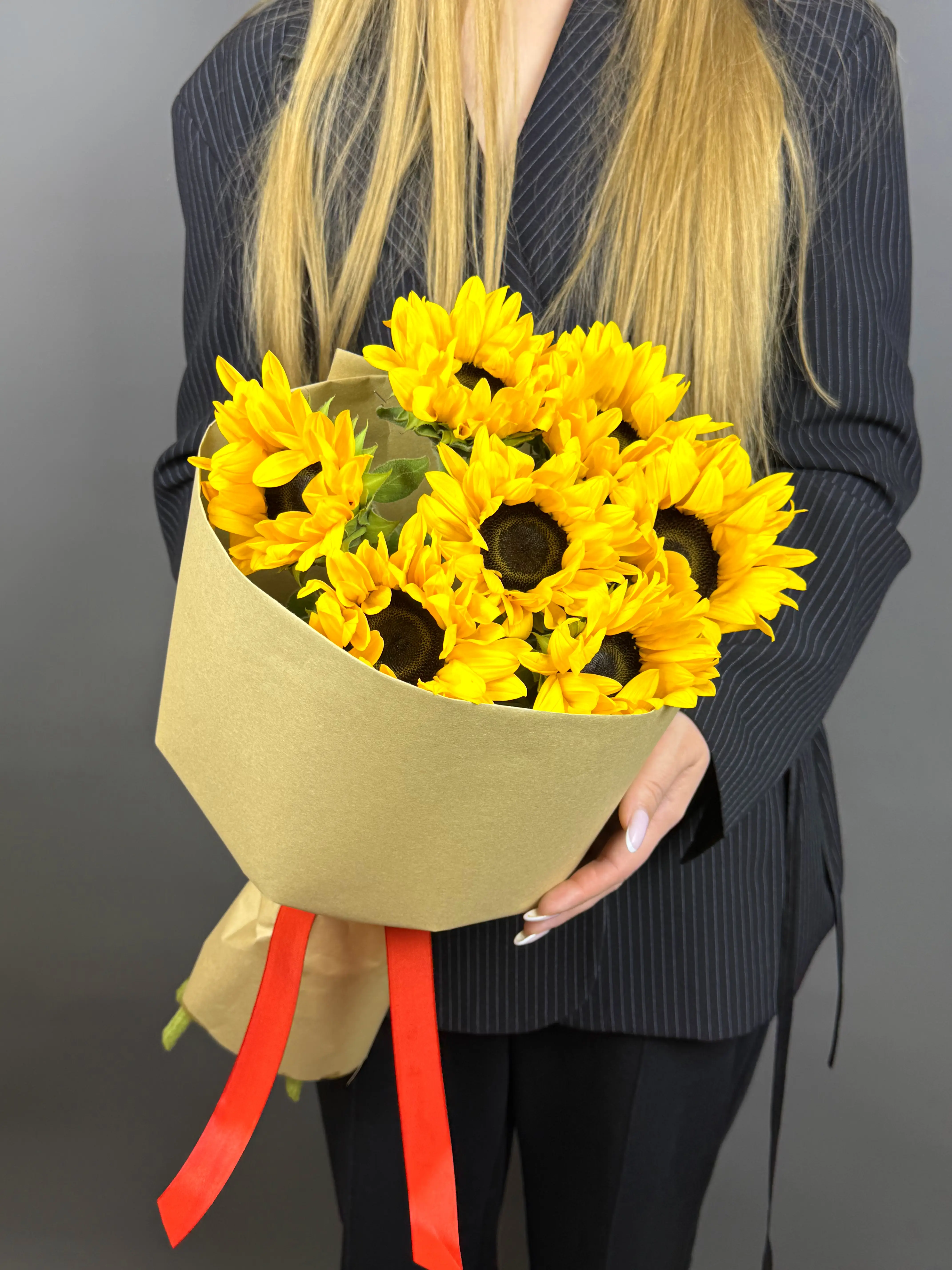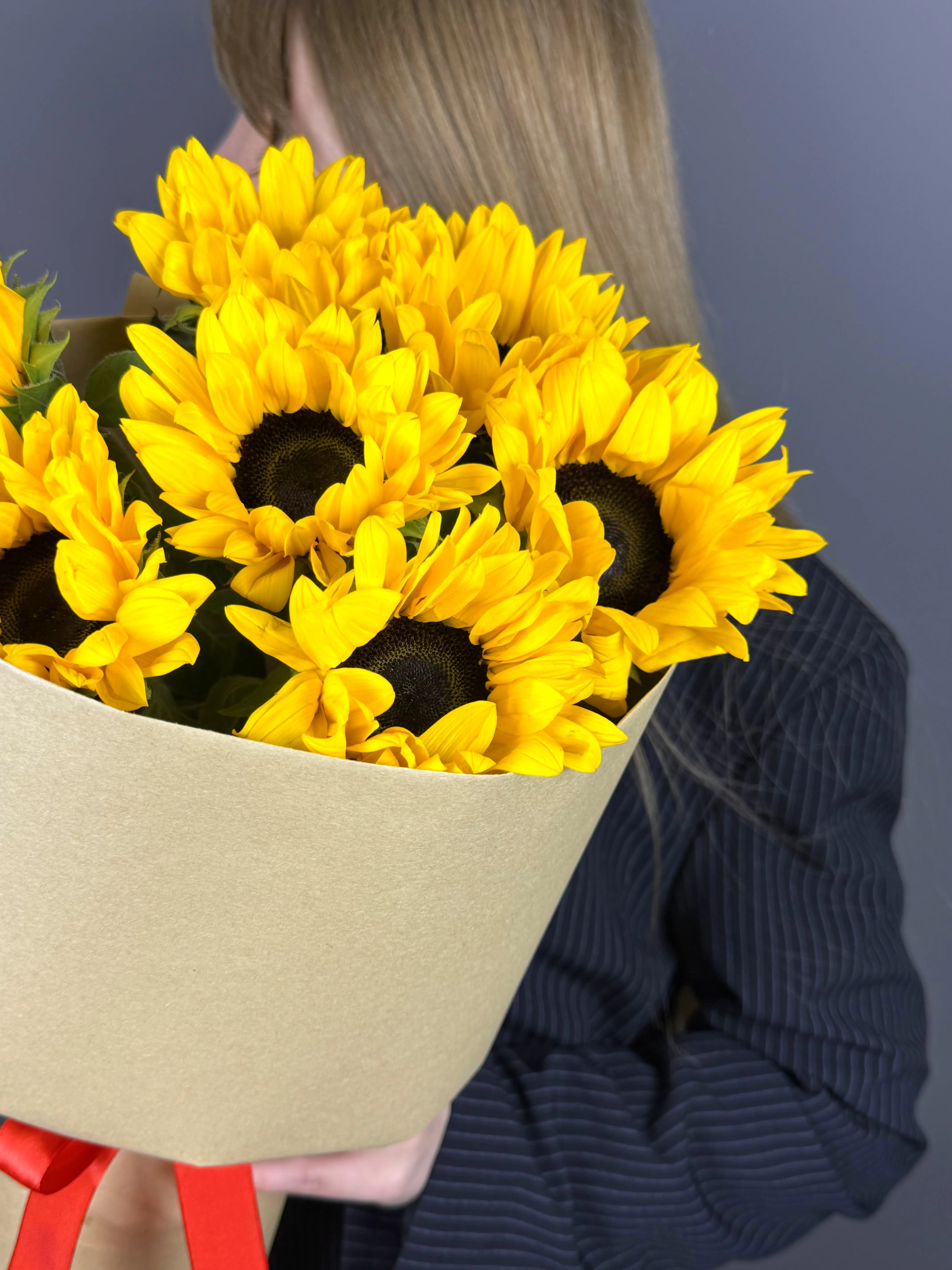 Букеты живых цветов "Солнечный" из подсолнухов в дизайнерской упаковке – это уникальное сочетание красоты и качества.