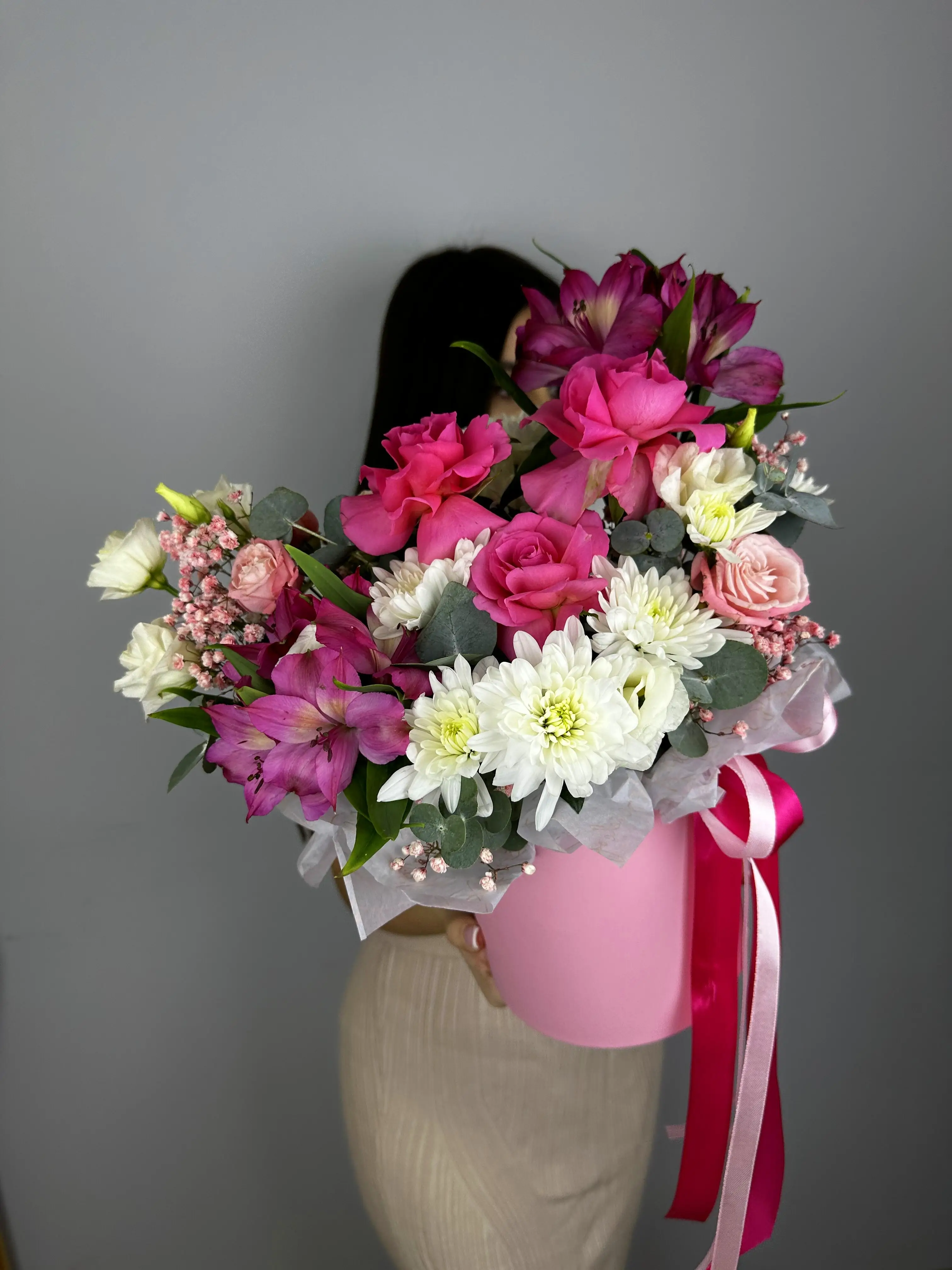 Букет живых цветов с розами и альстромерией в нежной шляпной коробке – это прекрасный выбор для тех, кто хочет подарить радость и теплоту своих чувств.