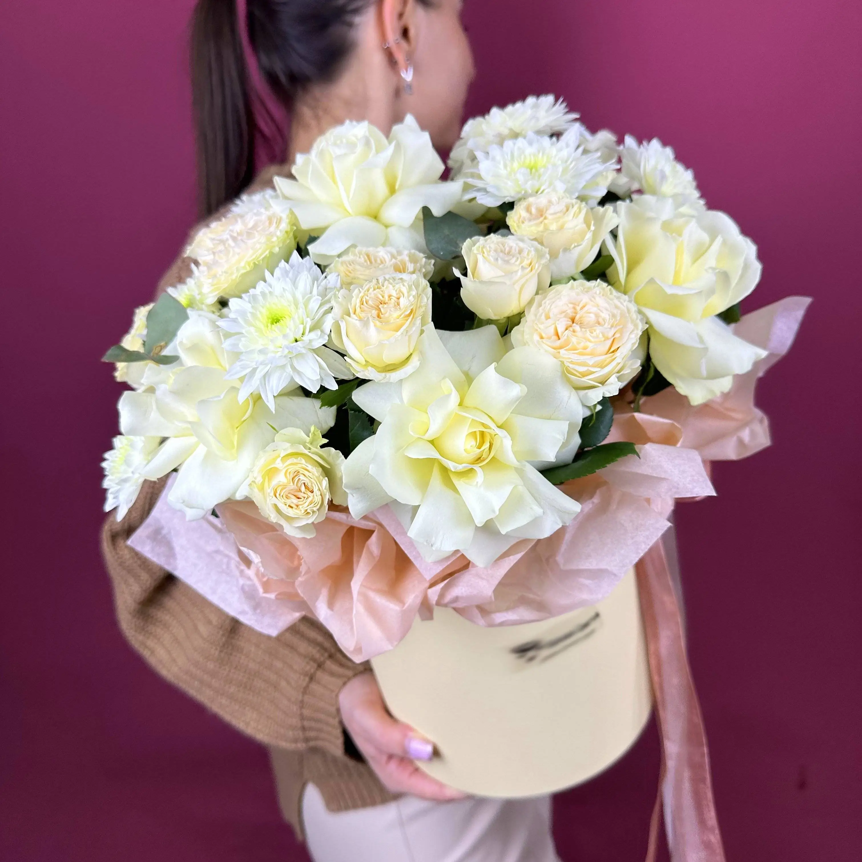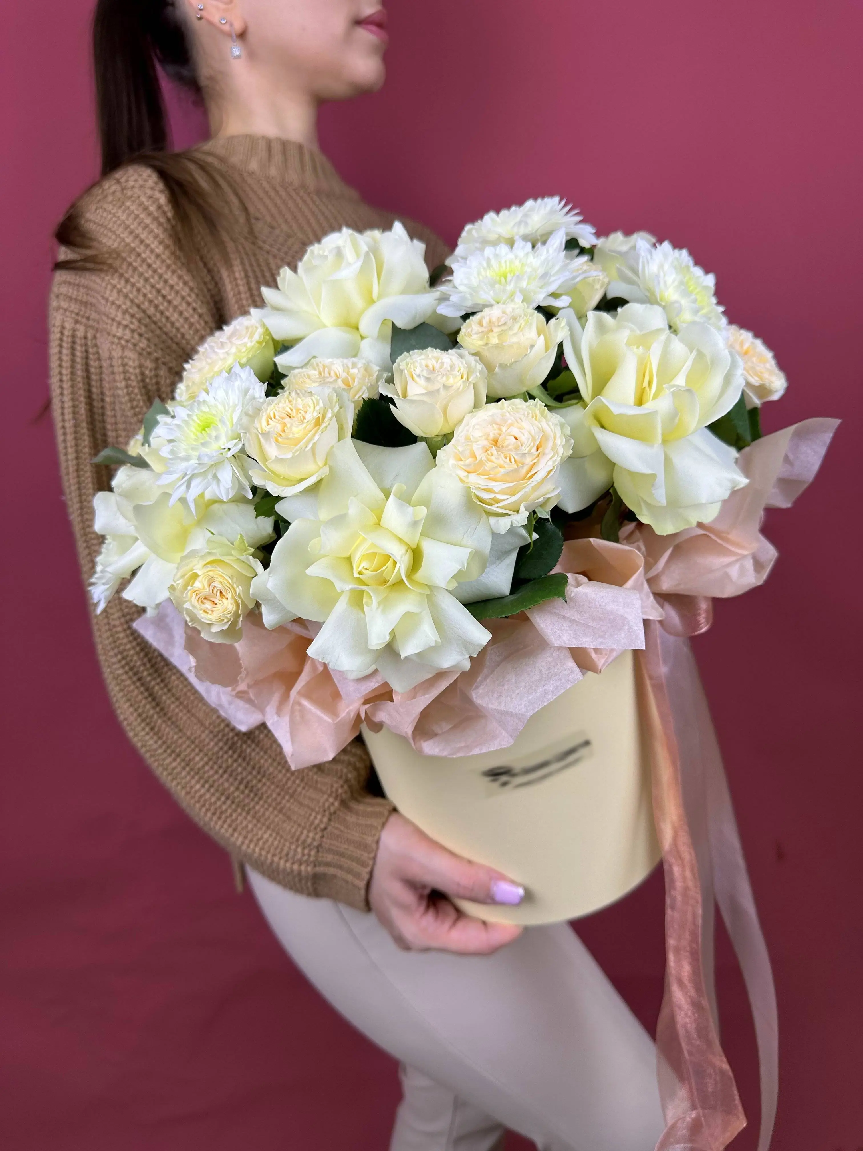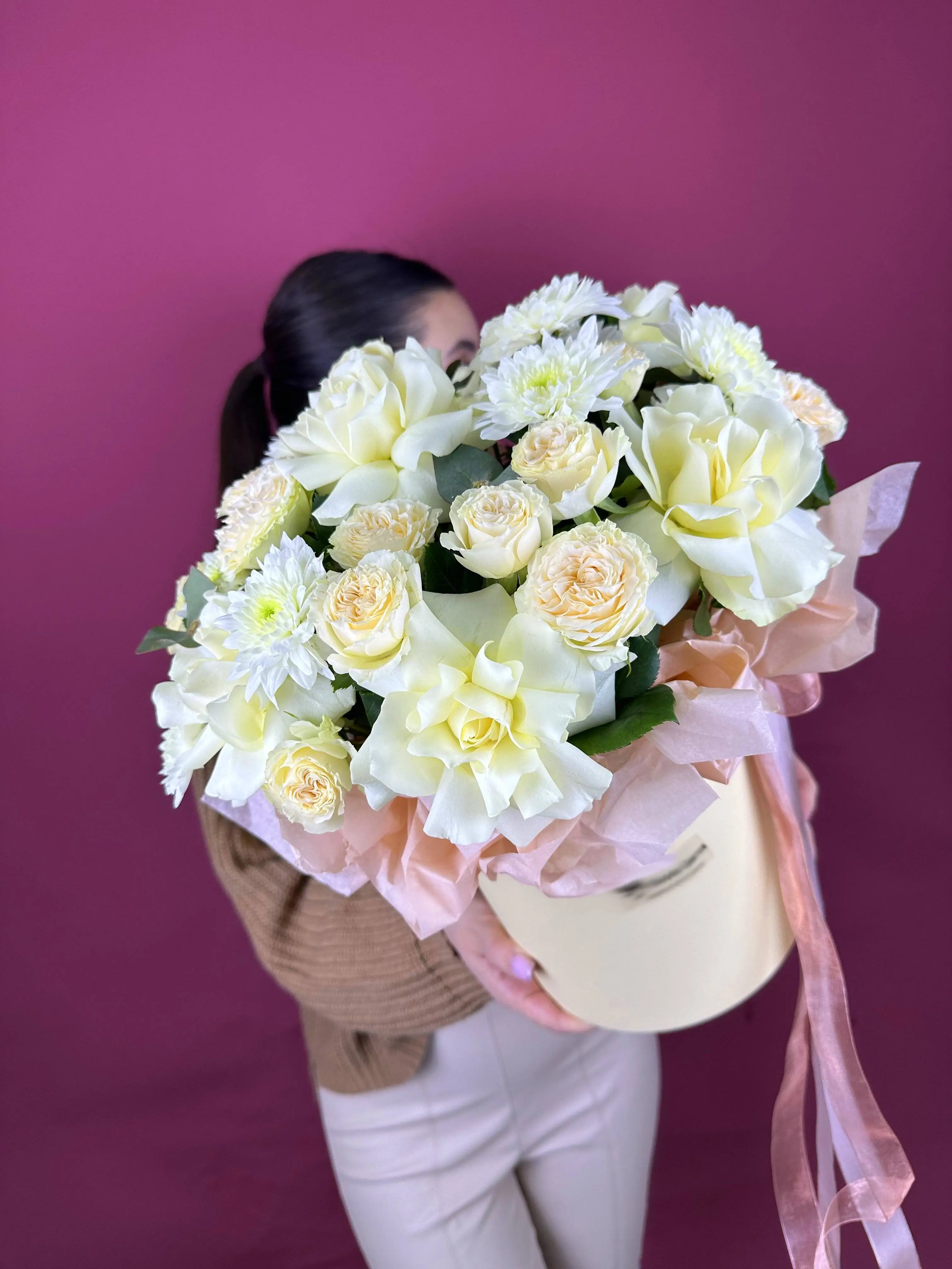 Букет с белыми французскими розами и хризантемой в шляпной коробке от Salon Buket – это сочетание элегантности и изысканности.
