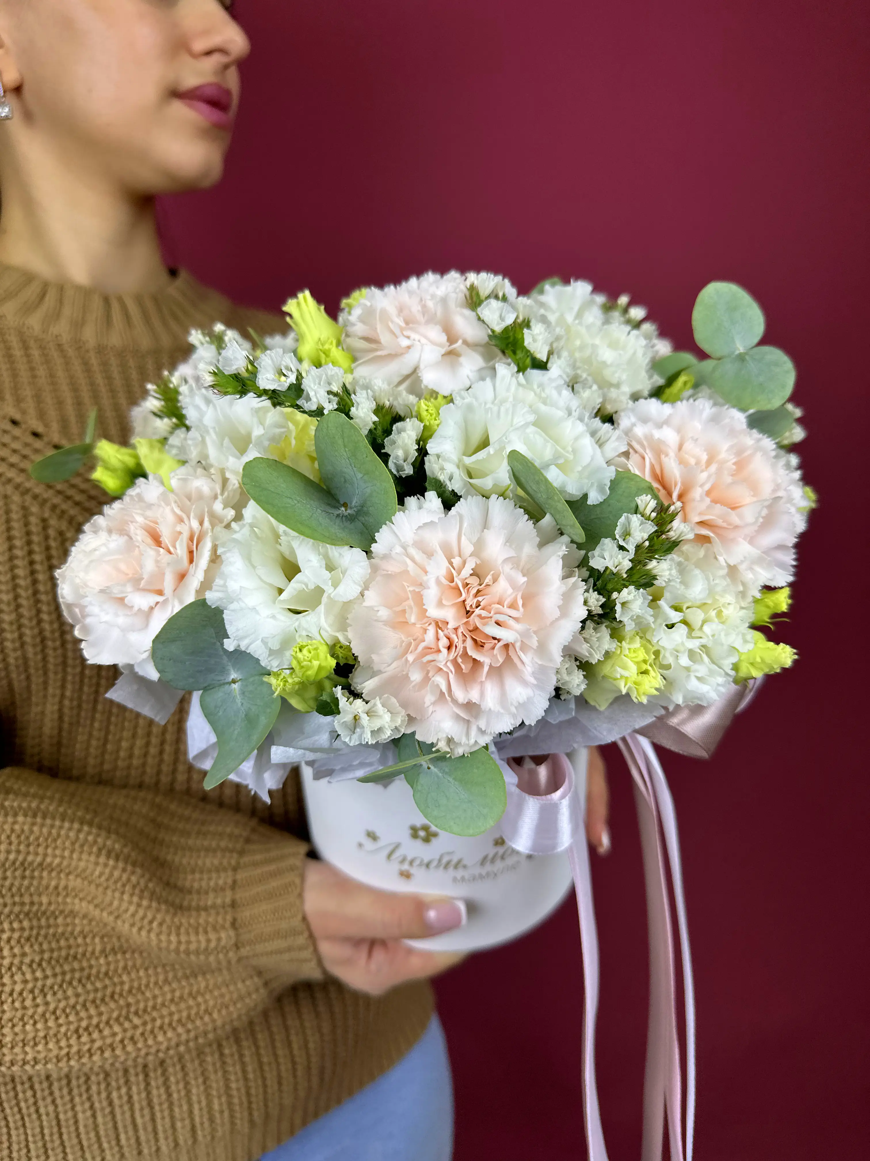 Букет живых цветов с диантусом (гвоздикой) и эустомой в шляпной коробке от Salon Buket – это сочетание изысканности и элегантности.