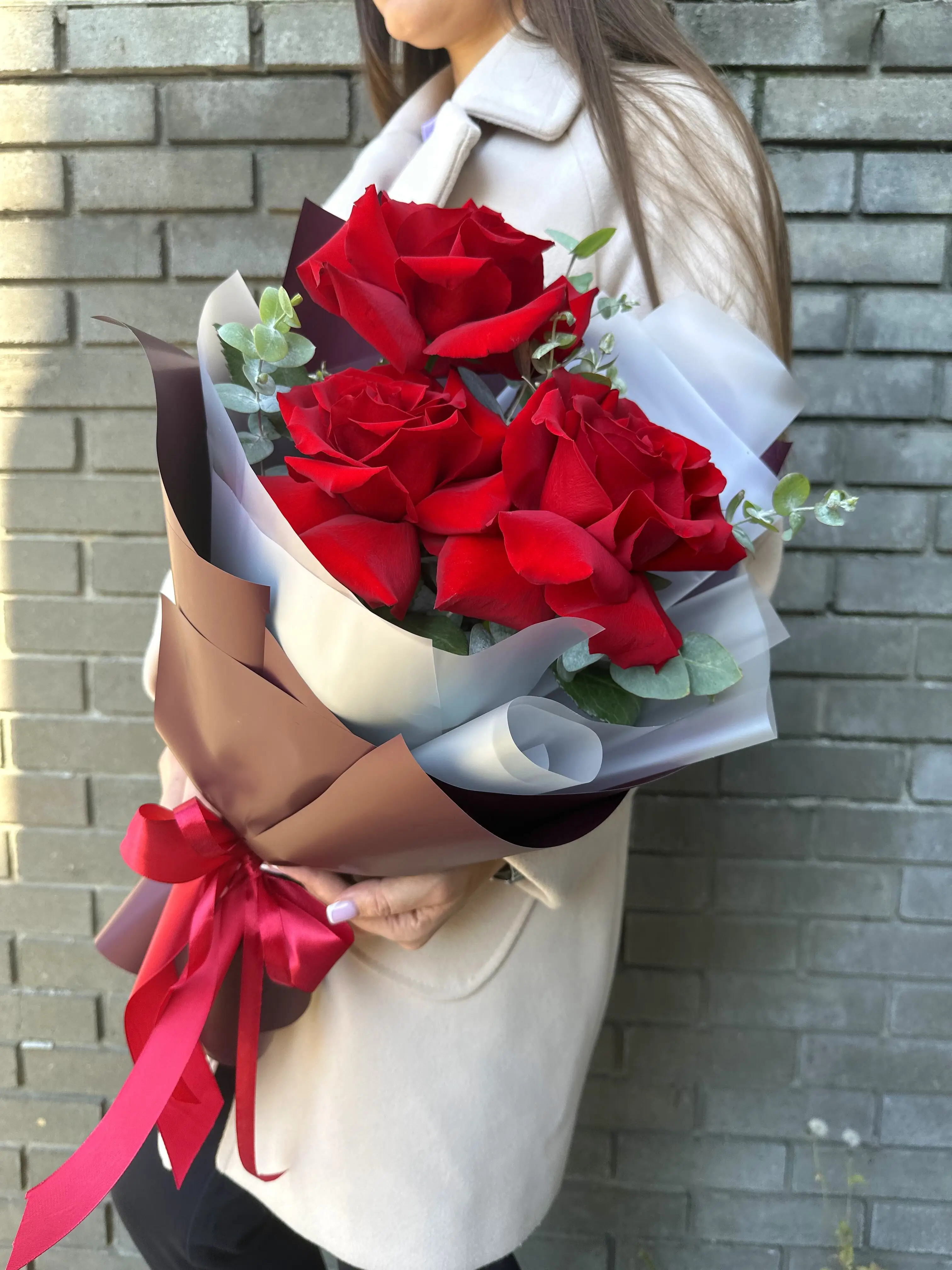 Букет живых цветов из 3 французских красных роз в дизайнерской упаковке — купить по цене от 1601 руб. с доставкой в Дзержинске