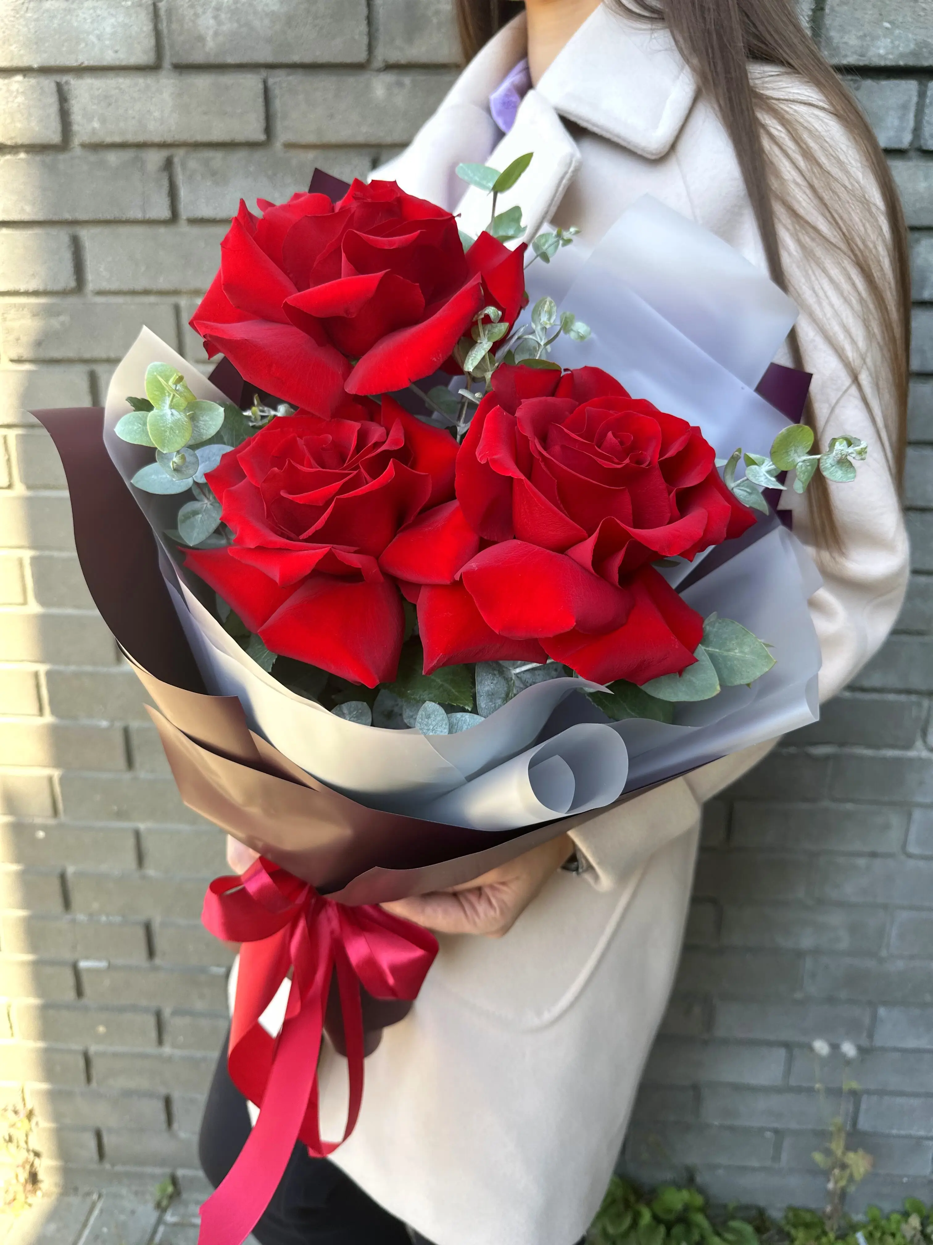 Букет живых цветов из 3 французских красных роз в дизайнерской упаковке