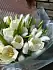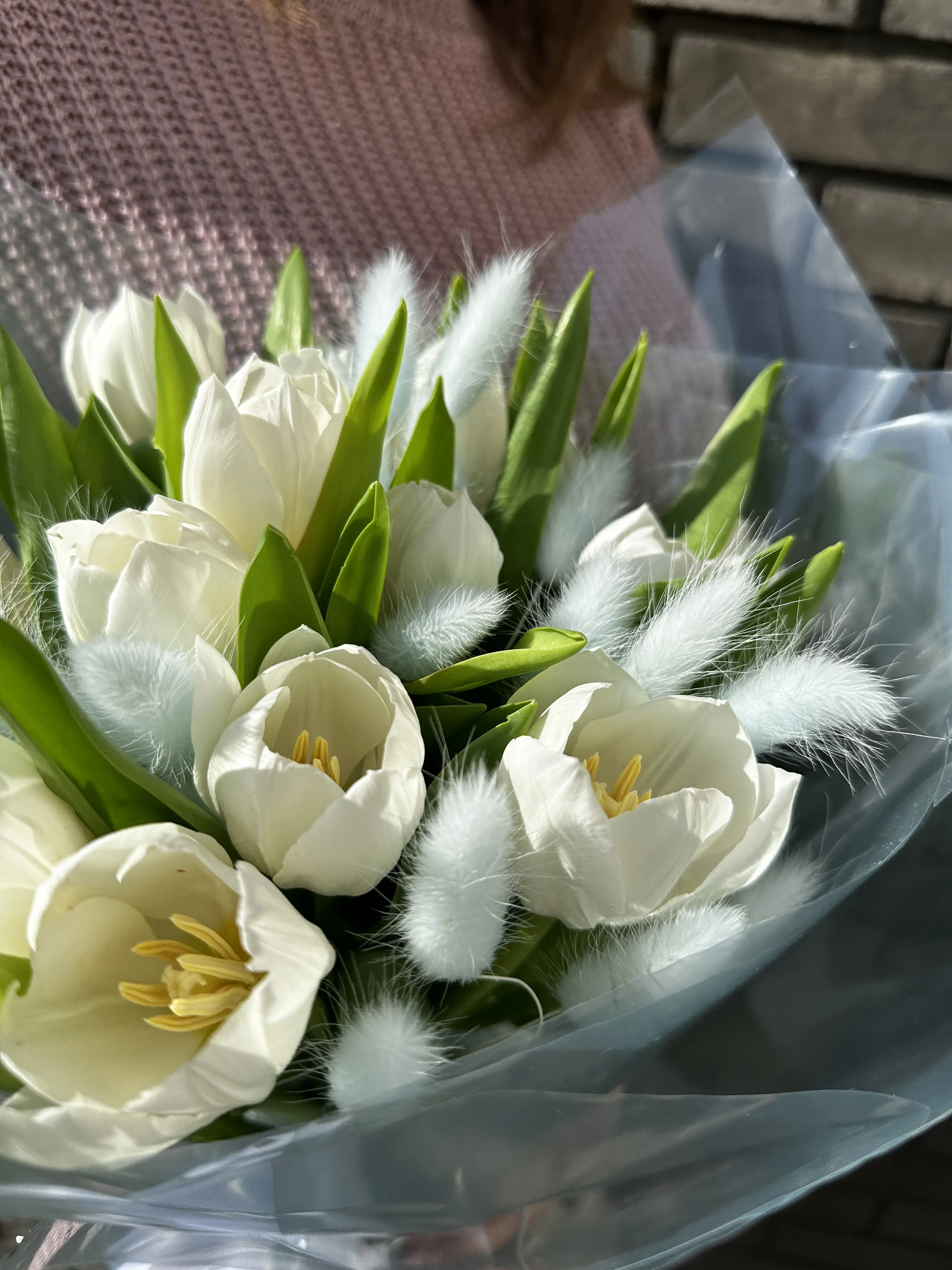 Букет живых цветов из белых тюльпанов в оформленный в дизайнерскую упаковку