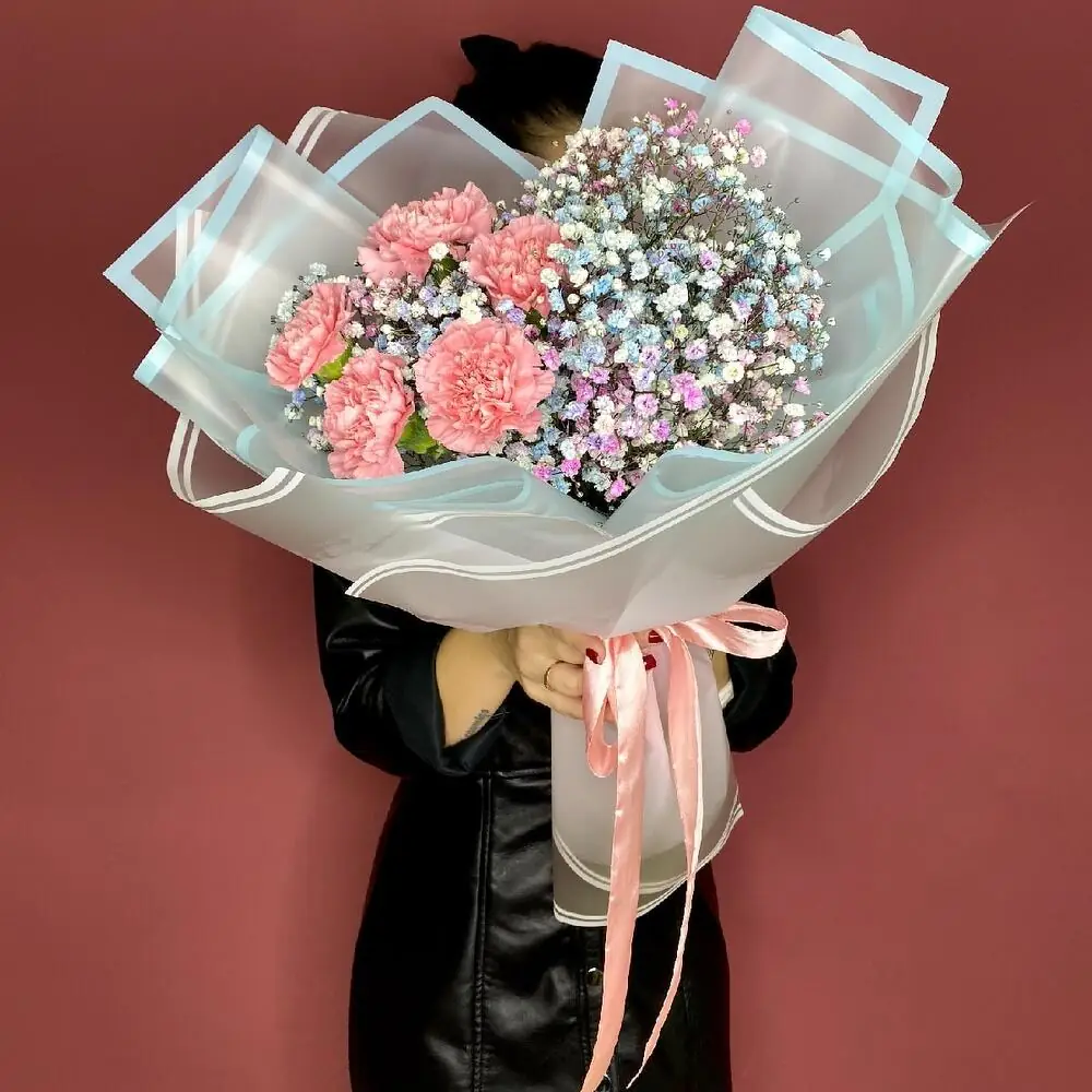 Букет живых цветов из диантусов и гипсофилы в дизайнерской упаковке — купить по цене от 2492 руб. с доставкой в Дзержинске