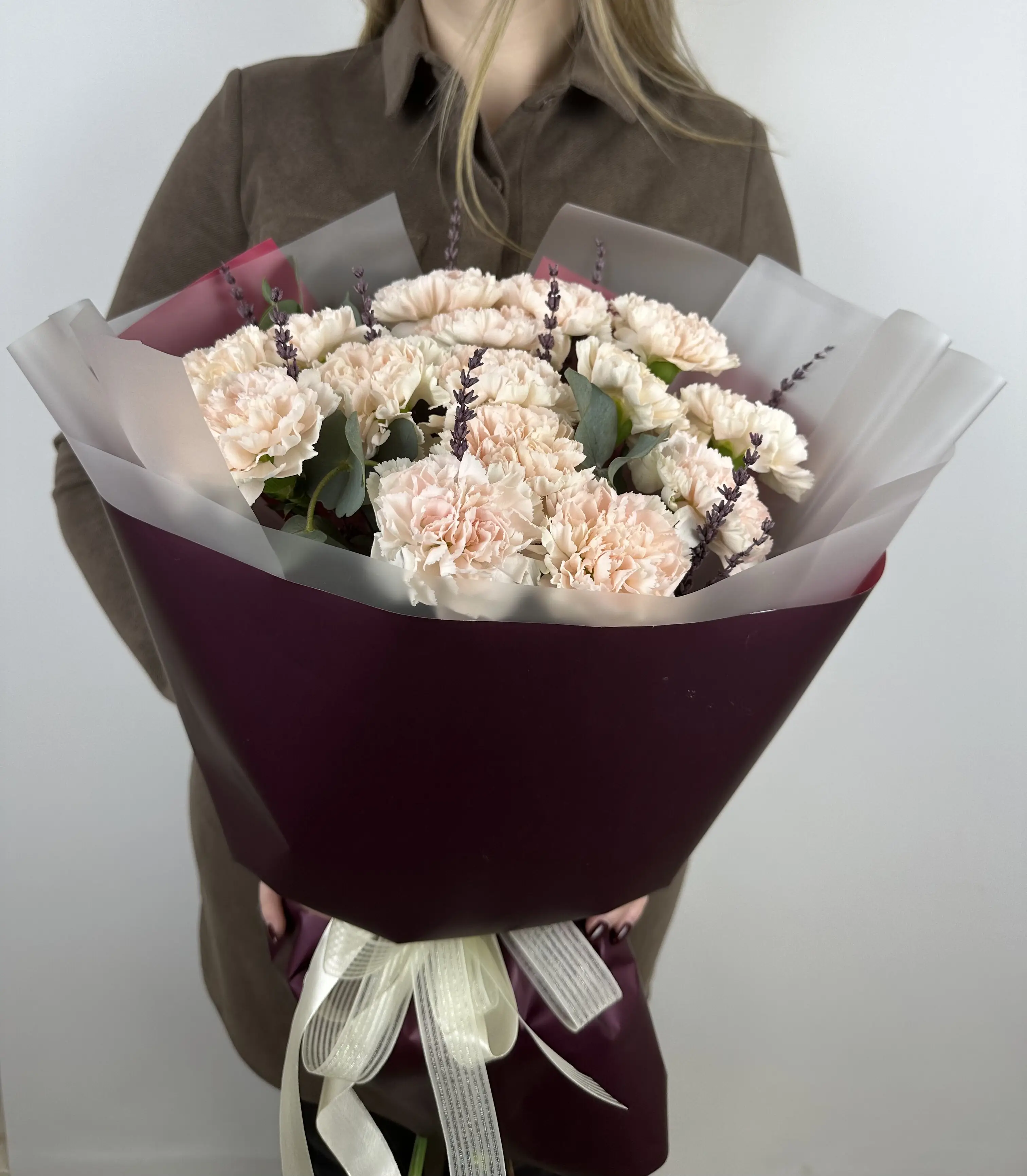 Букет живых цветов из диантусов и лаванды в дизайнерской упаковке — купить по цене от 3102 руб. с доставкой в Дзержинске